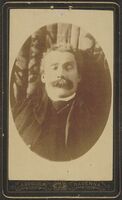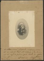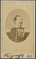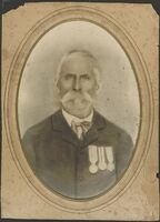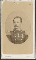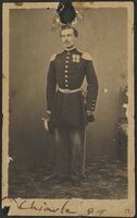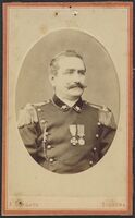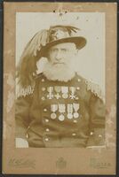 Ritratto di soldato in divisa in piedi a figura intera, con due medaglie appuntate al petto e spada