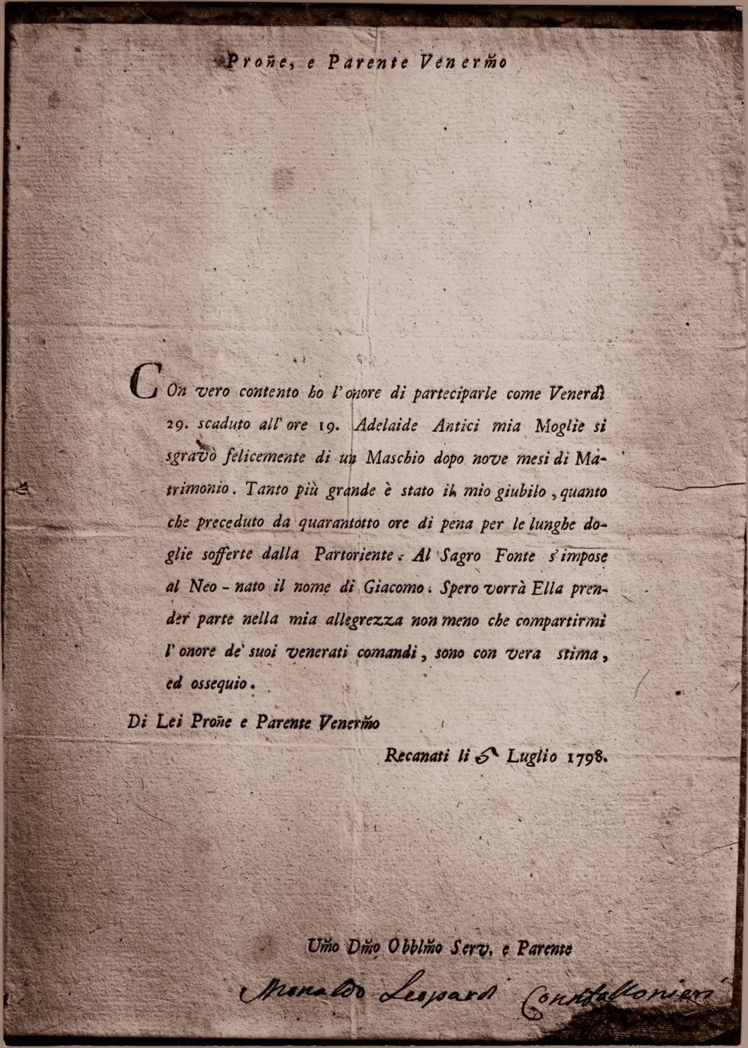 Invito di Monaldo Leopardi Confalonieri per la nascita del figlio Giacomo : Recanati, 5 luglio 1798