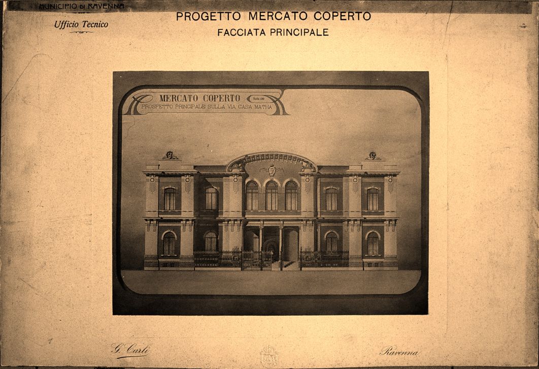 Progetto Mercato Coperto : prospetto principale sulla via Casa Matha Municipio di Ravenna : Ufficio tecnico