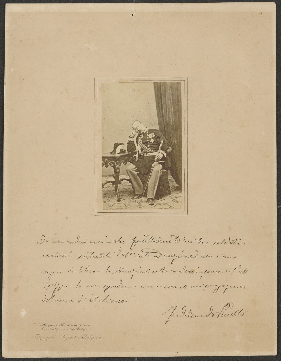 Riproduzione a stampa di nota manoscritta sul recto del supporto: "Io non credei mai che quattrocentomila soldati italiani patrioti dell'intera nazione non siano capaci di liberar la Venezia: se tu credessi, come soldato spezzerei la mia spada e come uomo mi vergognerei del nome di italiano. Ferdinando Pinelli"