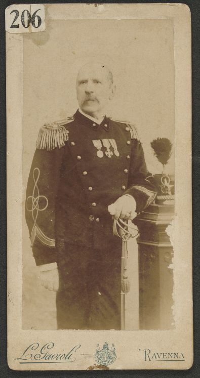 Giovanni Pasolini ritratto in abiti da soldato con tre medaglie appuntate sul petto