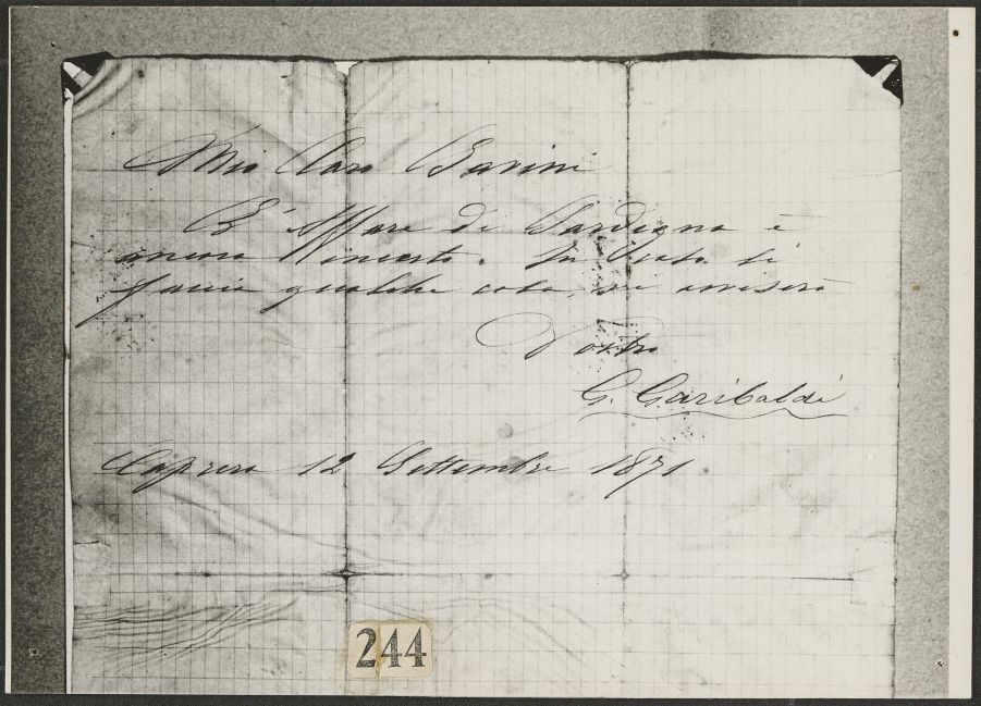 Fotografia di lettera autografa di Giuseppe Garibaldi a Giuseppe Savini (Caprera, 12 settembre 1871)