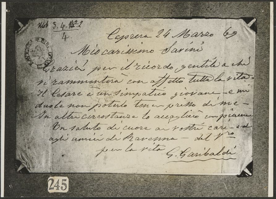 Fotografia di lettera autografa di Giuseppe Garibaldi a Giuseppe Savini (Caprera, 24 marzo 1869)