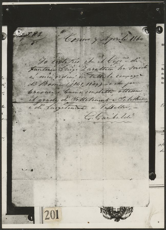 Fotografia di lettera autografa di Giuseppe Garibaldi in cui certifica che Luigi Zarattini ha servito ai suoi ordini (Torino, 7 aprile 1860)