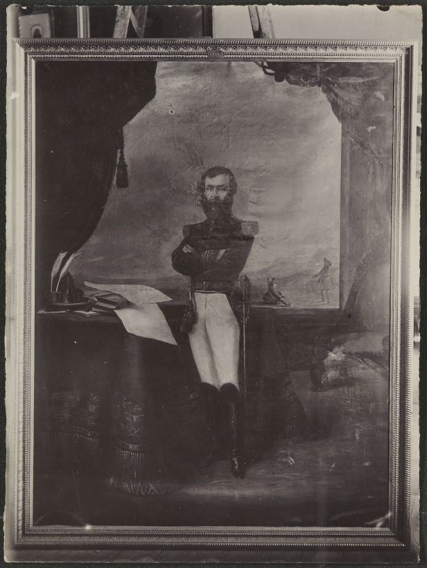 Dipinto che ritrae soldato in divisa a braccia conserte |