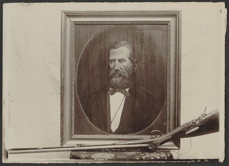 Fucile appoggiato di fronte a un dipinto in cui è ritratto un uomo