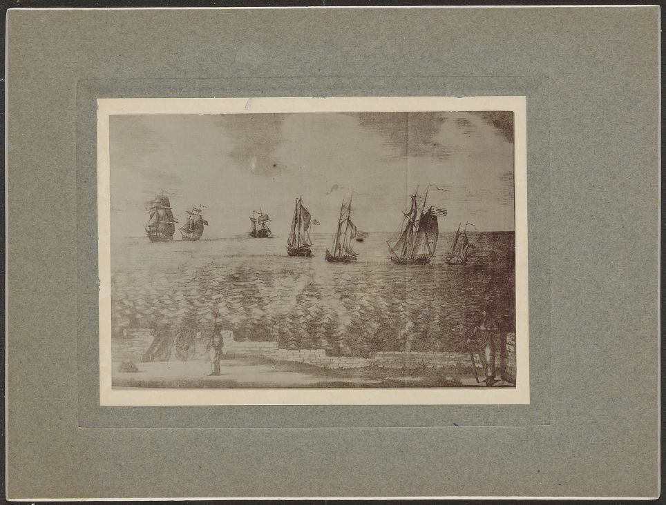 Illustrazione ritraente due soldati sulla costa al di qua di un muretto, mentre in mare navigano sette navi con la bandiera argentina
