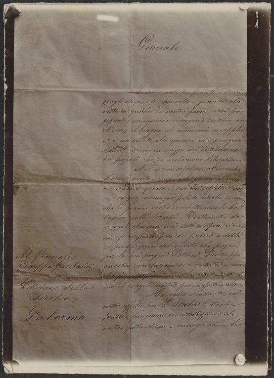 Riproduzione di lettera manoscritta inviata al generale Giuseppe Garibaldi