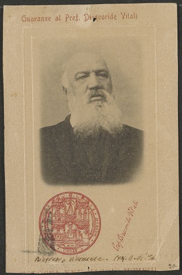 Sul recto: a stampa in alto “Onoranze al Prof. Dioscoride Vitali”; timbro dell’Università di Bologna; nota manoscritta a penna “Ringrazio vivamente. Prof. N. Vitali”