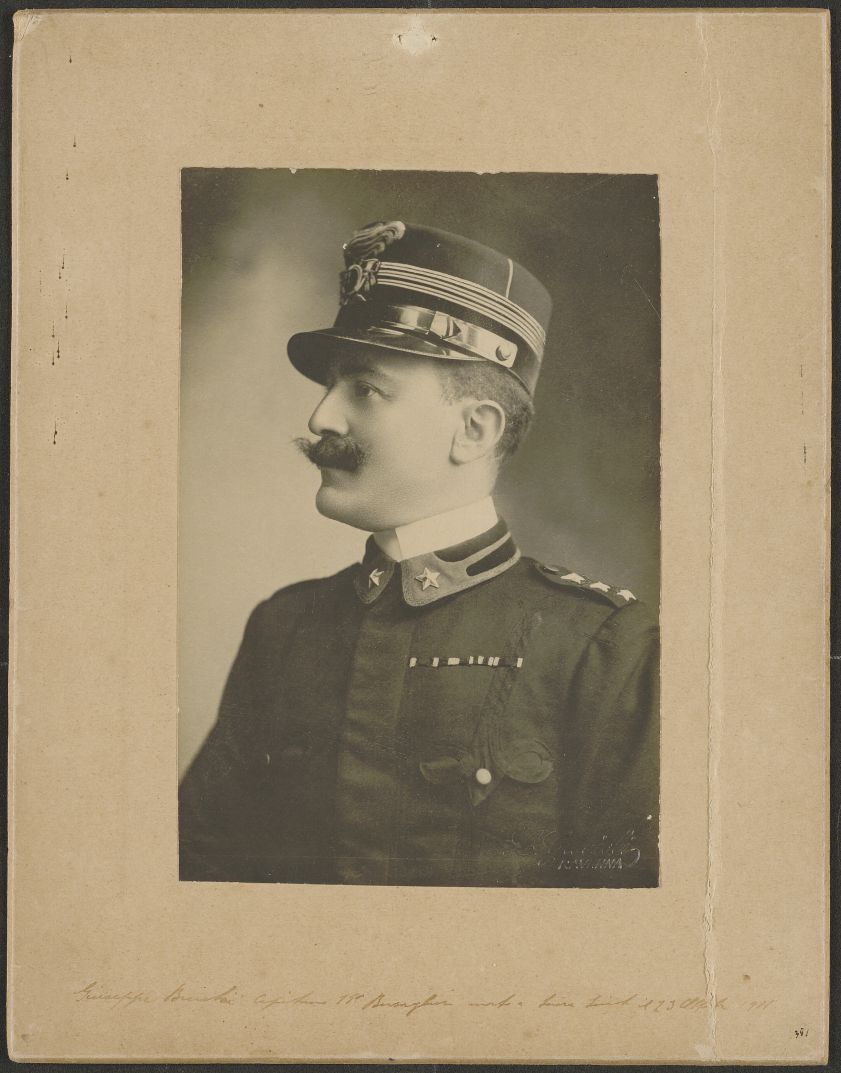 Sul recto: timbro a secco di Luigi Gavioli; nota manoscritta in basso sul supporto: “Giuseppe B… Capitano 11° Bersaglieri morto a … il 23 Aprile 1911”; a china in basso a destra sul supporto: “351”