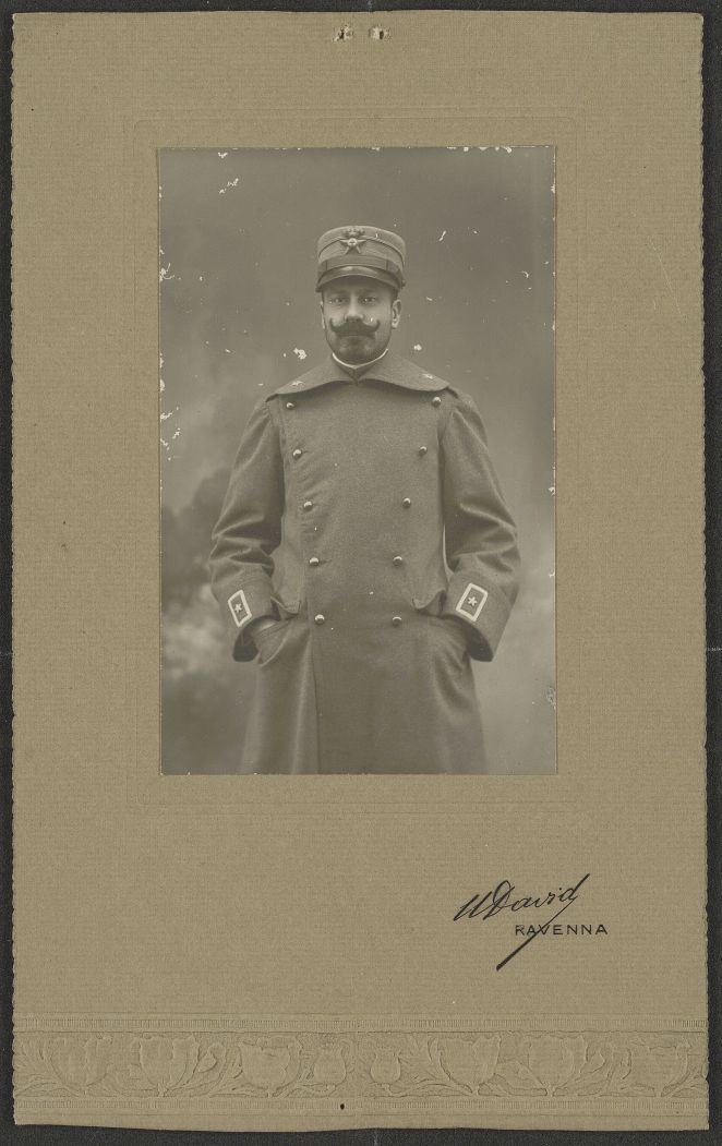 Ritratto di uomo con baffi a manubrio che indossa cappotto e berretto militari