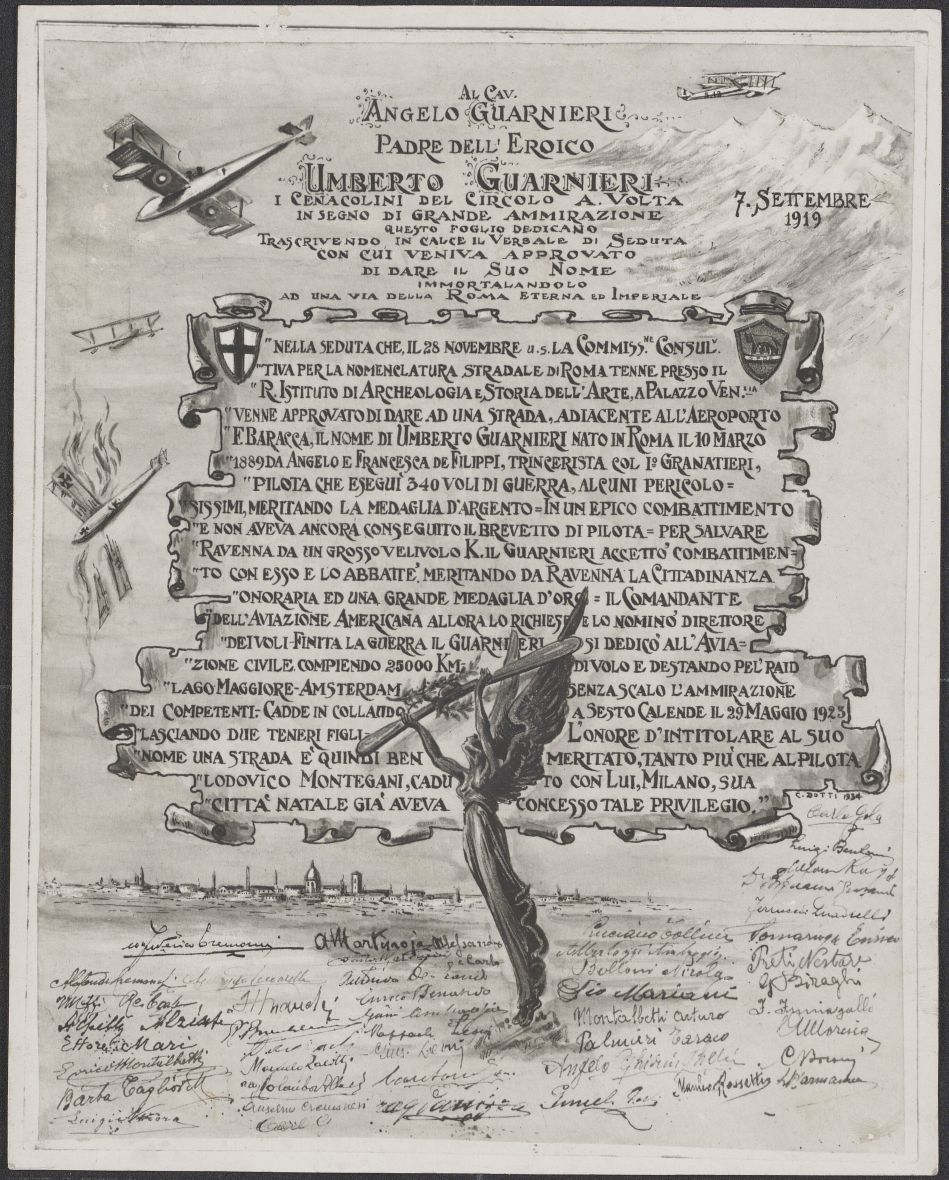 Documento destinato al Cav. Angelo Guarnieri in cui si comunica l’intestazione di una via della città di Roma al figlio Umberto Guarnieri, datato 7 settembre 1919