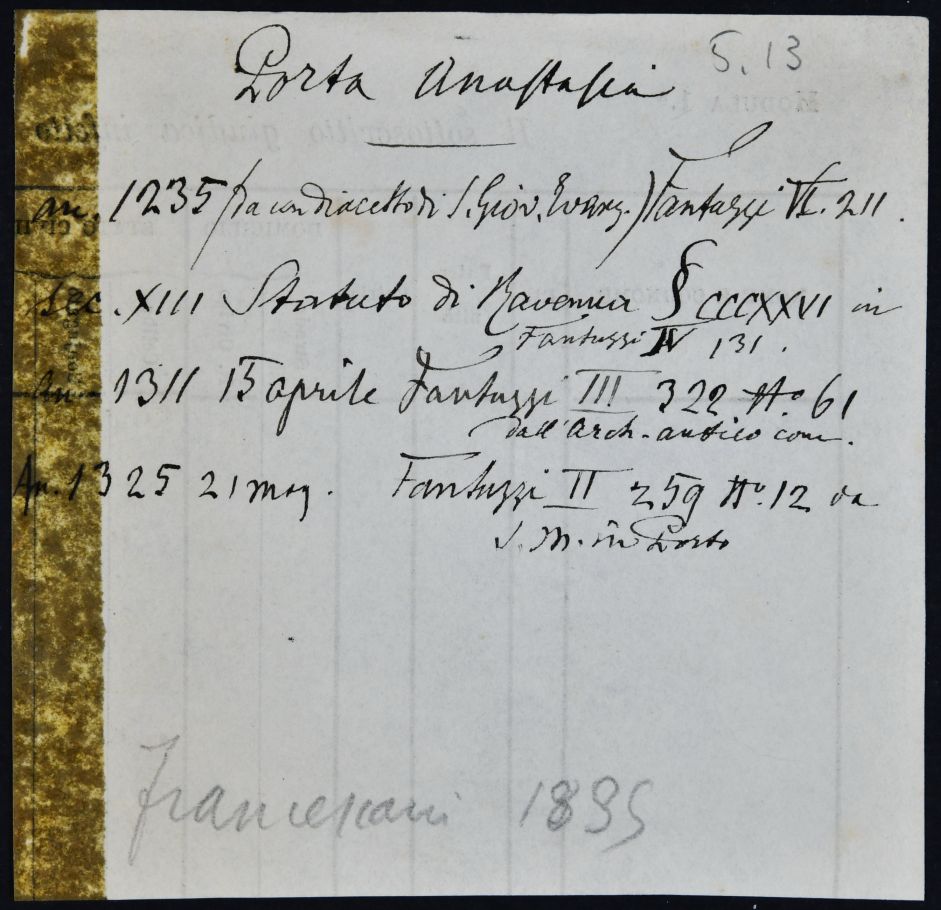 Nota manoscritta con riferimento a "Monumenti ravennati de' secoli di mezzo per la maggior parte inediti" di Marco Fantuzzi (tomo VI p. 211; tomo IV p.131; tomo III p. 322; tomo II p. 259)
