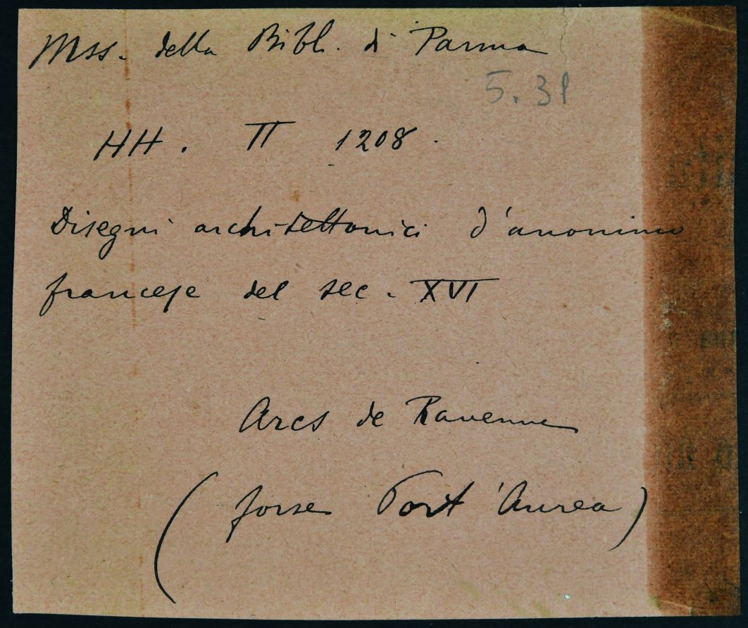 Nota manoscritta con rimando alla Biblioteca di Parma, HH. TT 1208, disegno architettonico d' anonimo francese del sec. XVI