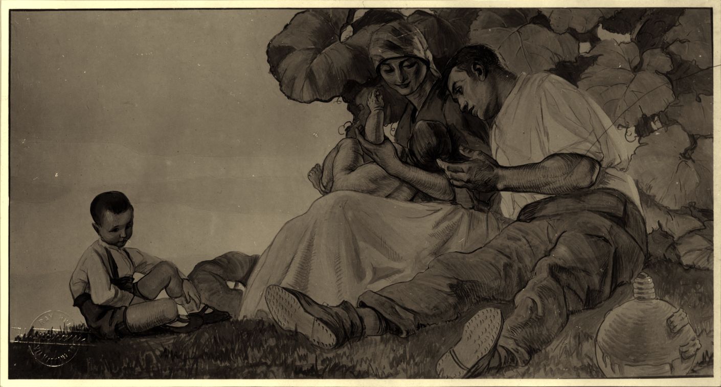 Particolare dell'affresco del soffitto della sala della casa del Fascio a Conselice
