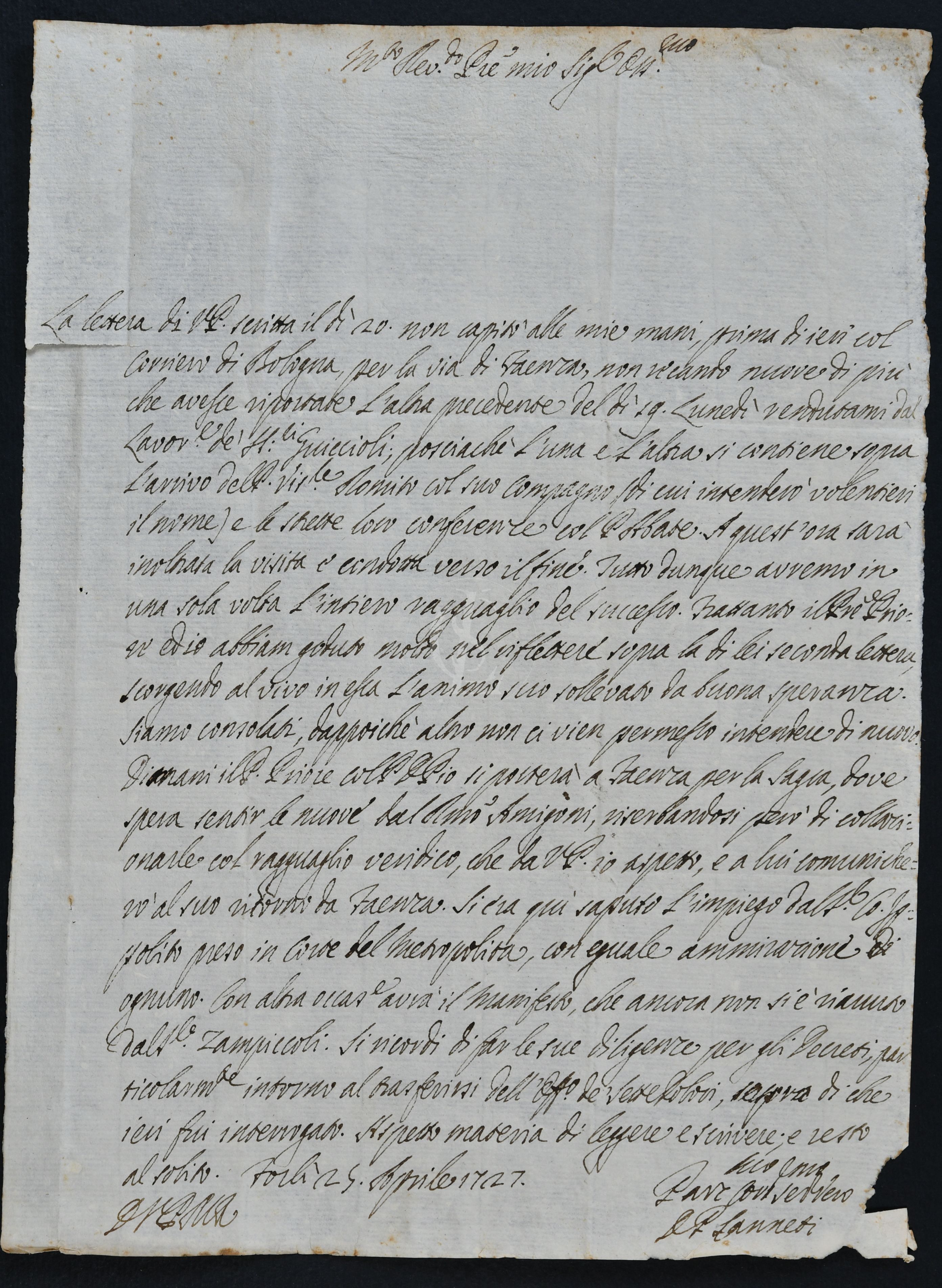 Rispondo alla sospirata sua lettera, scritta oggi il dì 28, con avvisarne... |