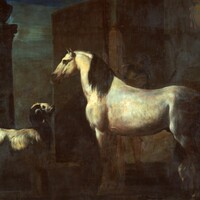 Cavallo bianco volto a sinistra e montone di fronte a lui |