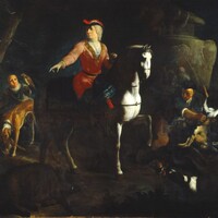 Ritorno dalla caccia con figura di donna a cavallo, valletto con falco, assistente con cacciagione, cani |