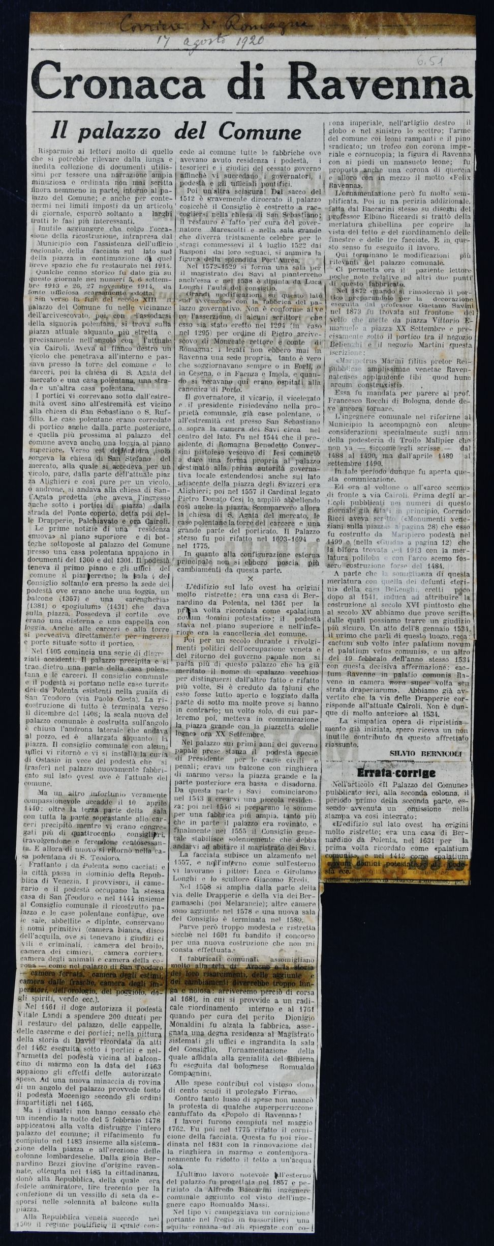 Ritaglio dell'articolo di Silvio Bernicoli sulla storia del Palazzo comunale di Ravenna dal Corriere di Romagna del 17 agosto 1920