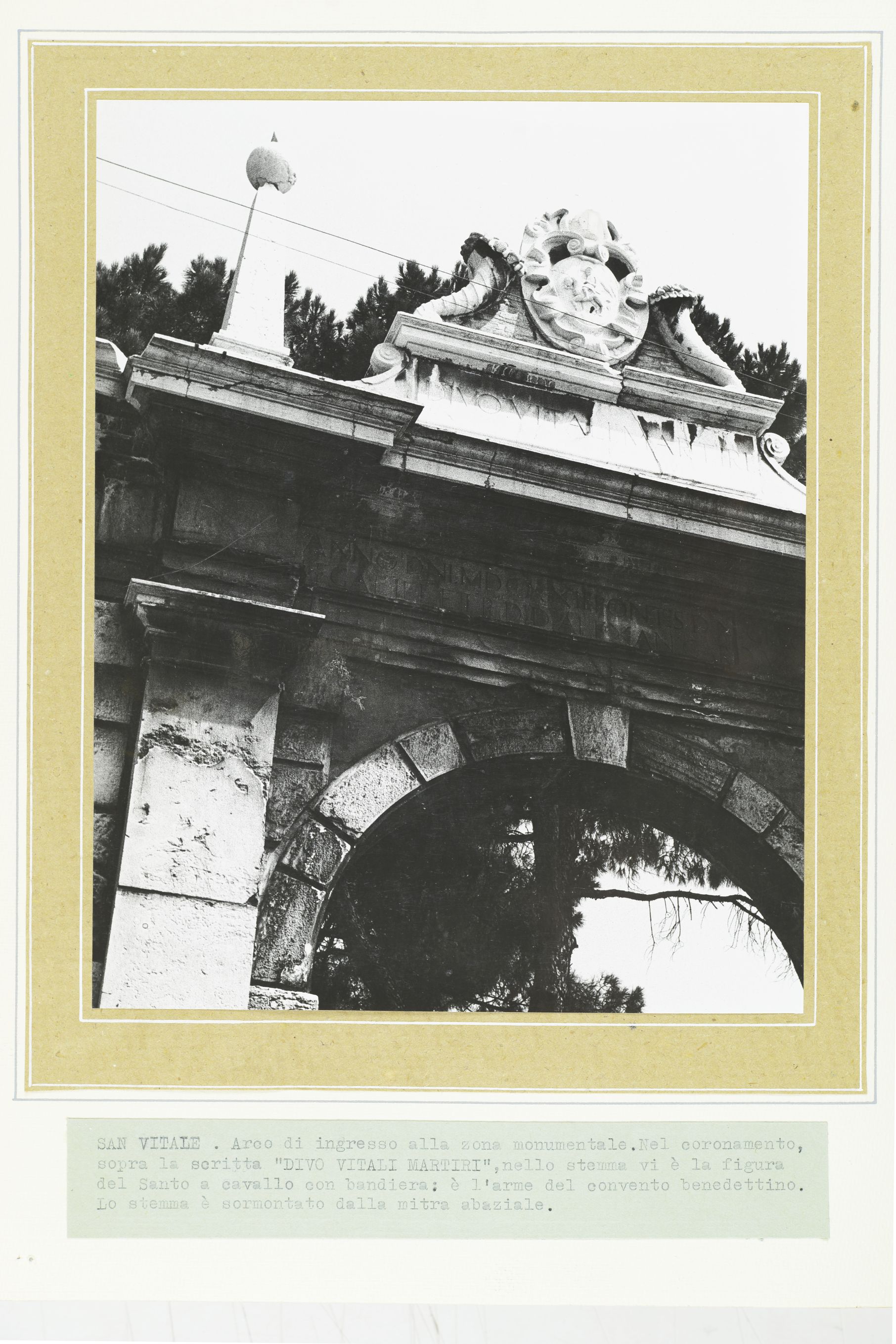 Titolo desunto da didascalia dattiloscritta incollata sul cartoncino di supporto: San Vitale: Arco di ingresso alla zona monumentale. Nel coronamento, sopra la scritta "DIVO VITALI MARTIRI", nello stemma vi è la figura del Santo a cavallo con bandiera: è l'arme del convento benedettino. Lo stemma è sormontato dalla mitra abaziale [!].