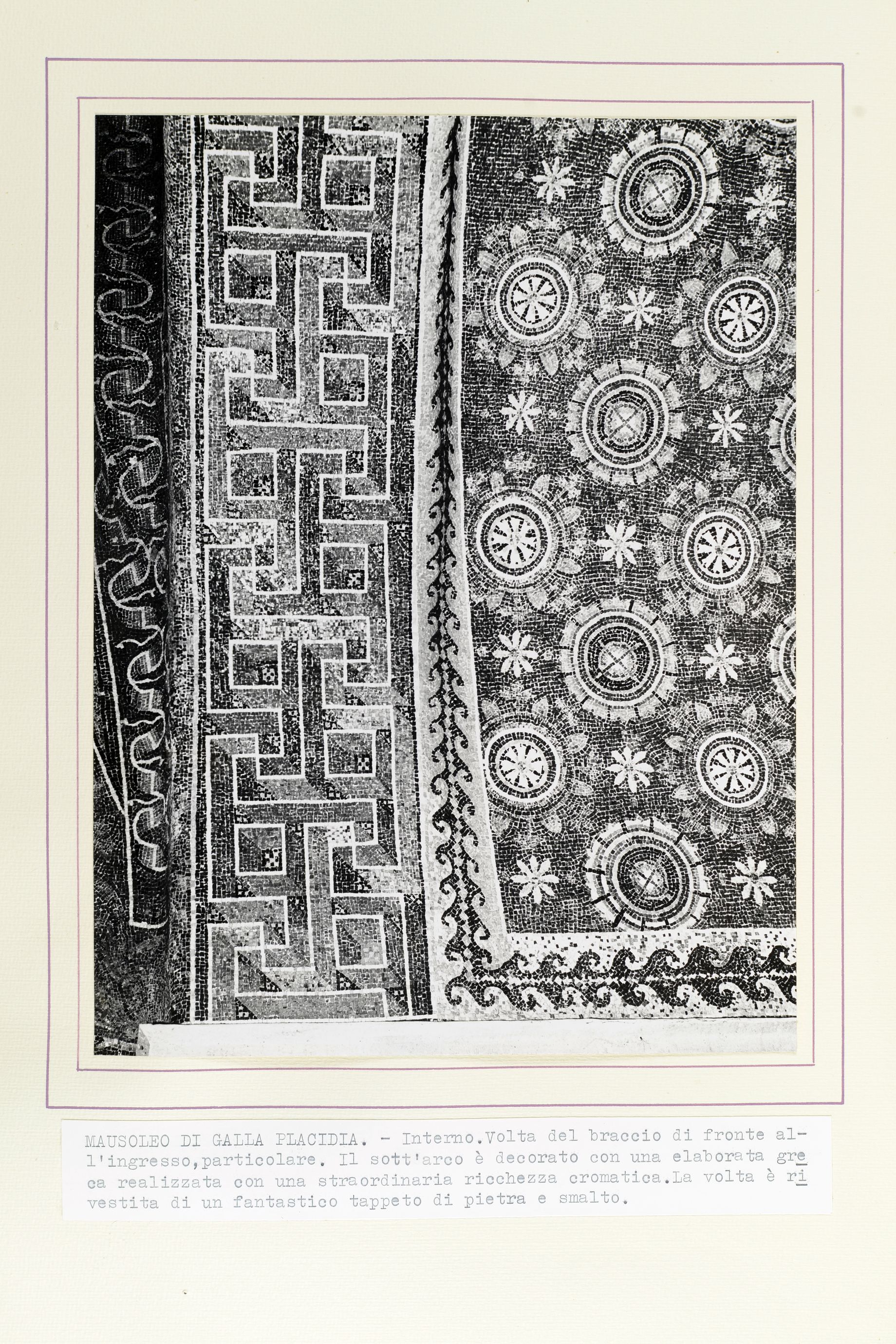 Titolo desunto da didascalia dattiloscritta incollata sul cartoncino di supporto: Mausoleo di Galla Placidia.- Interno. Volta del braccio di fronte all'ingresso, particolare. Il sott'arco è decorato con una elaborata greca realizzata con una straordinaria ricchezza cromatica. La volta è rivestita di un fantastico tappeto di pietra e smalto.