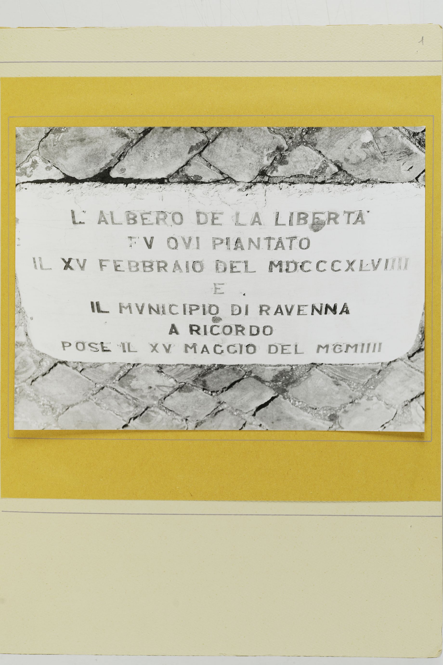 Sulla targa, l'iscrizione: L'albero de la libertà fu qui piantato il XV febbraio del MDCCCXLVIIII e il municipio di Ravenna a ricordo pose il XV maggio del MCMIIII.