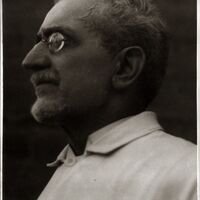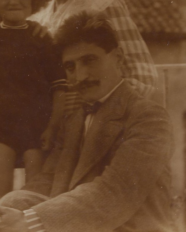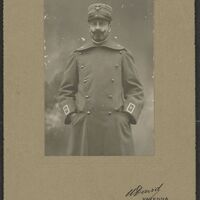 Ritratto di uomo con baffi a manubrio che indossa cappotto e berretto militari |
