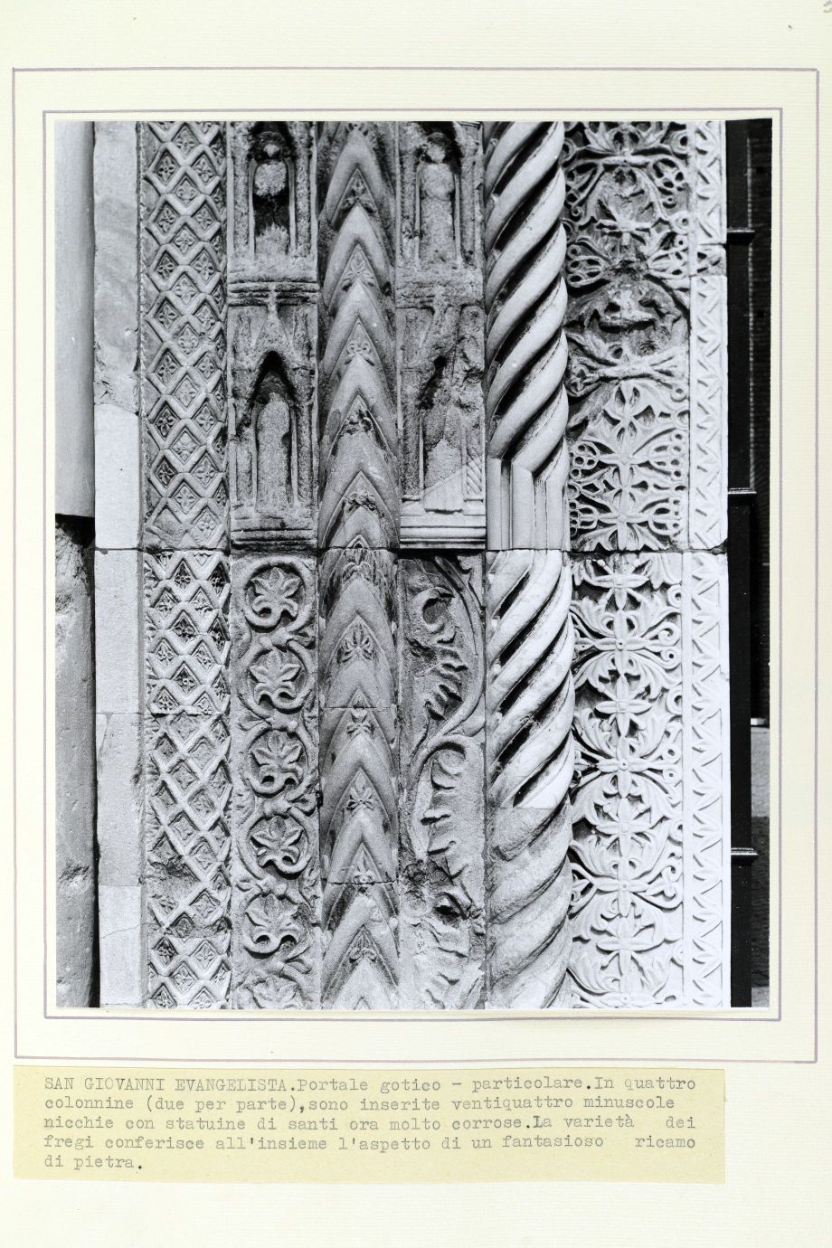 Titolo desunto da didascalia dattiloscritta incollata sul cartoncino di supporto: San Giovanni Evangelista. Portale gotico-particolare. In quattro colonnine (due per parte), sono inserite ventiquattro minuscole nicchie con statuine di santi ora molto corrose. La varietà dei fregi conferisce all'insieme l'aspetto di un fantasioso ricamo di pietra.