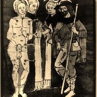 Biblioteca Classense: xilografia che rappresenta S. Sebastiano, S. Vincenzo Ferrier, S. Pietro martire e S. Rocco dal codice 485 |