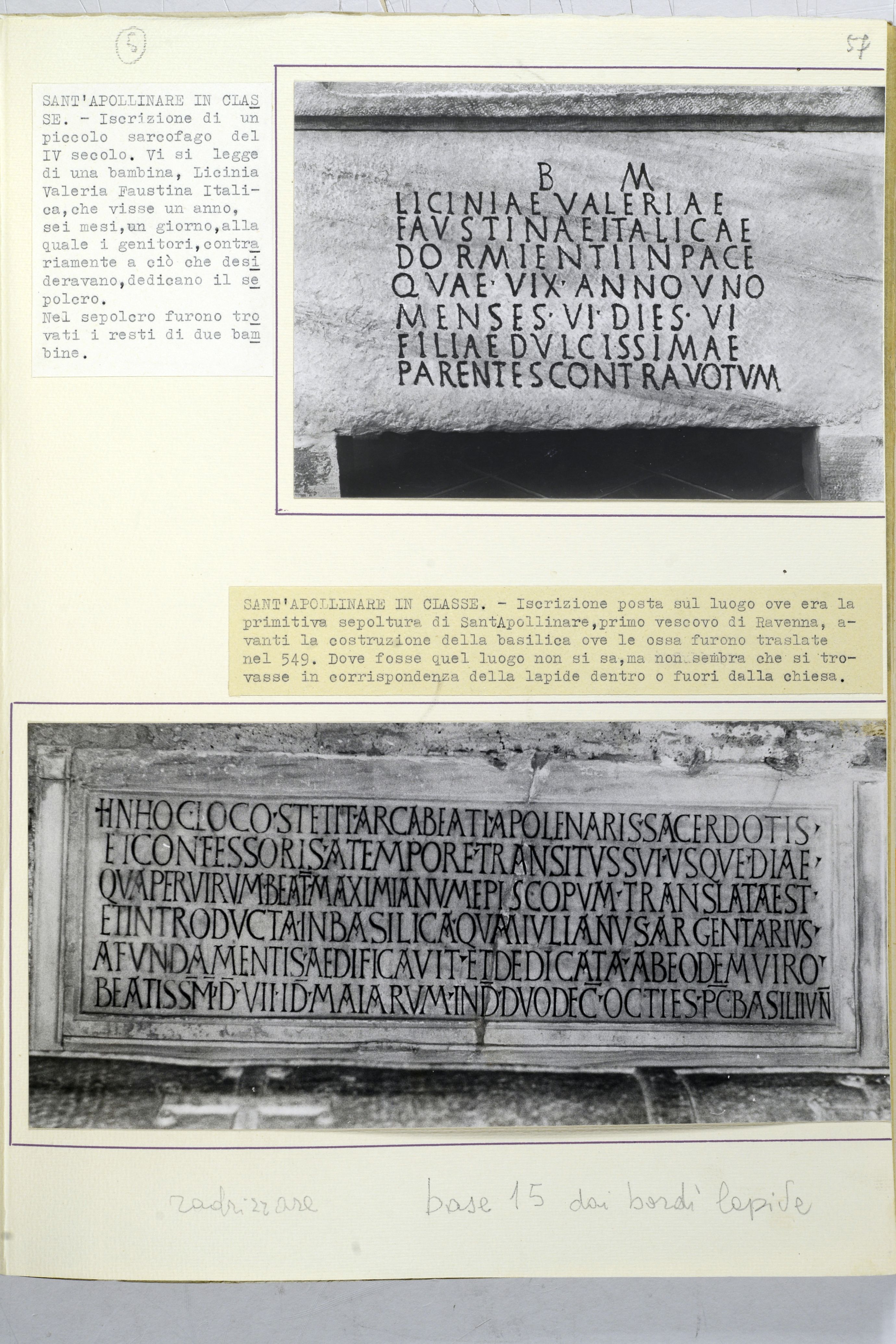 Titolo desunto da didascalie dattiloscritte incollate sul cartoncino di supporto: "Sant'Apollinare in Classe. -Iscrizione di un piccolo sarcofago del IV secolo. Vi si legge di una bambina, Licinia Valeria Faustina Italica, che visse un anno, sei mesi, un giorno, alla quale i genitori, contrariamente a ciò che desideravano, dedicano il sepolcro. Nel sepolcro furono ritrovati i resti di due bambine."/ "Sant'Apollinare in Classe.- Iscrizione posta sul luogo ove era la primitiva sepoltura di Sant'Apollinare, primo vescovo di Ravenna, avanti la costruzione della basilica ove le ossa furono traslate nel 549. Dove fosse quel luogo non si sa, ma non sembra che si trovasse in corrispondenza della lapide dentro o fuori la chiesa."