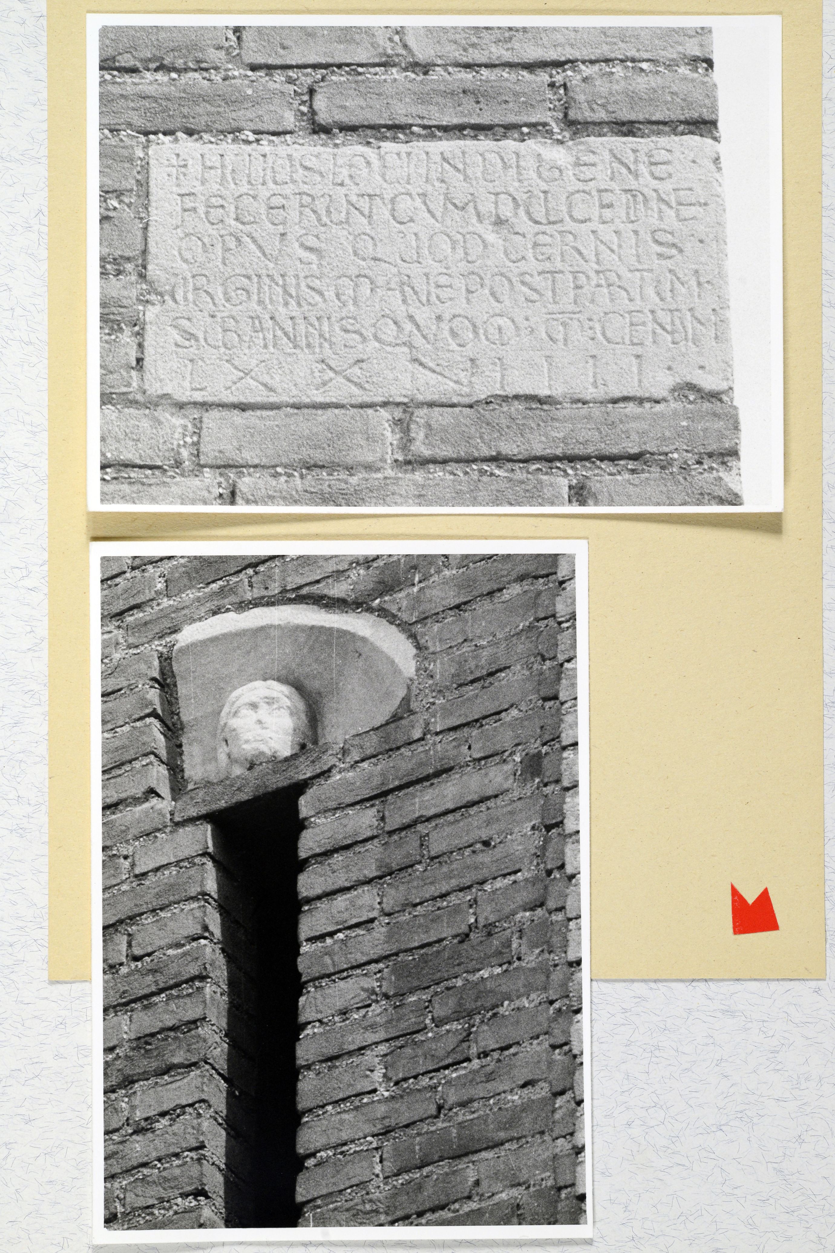 Iscrizione e particolare scultura di volto