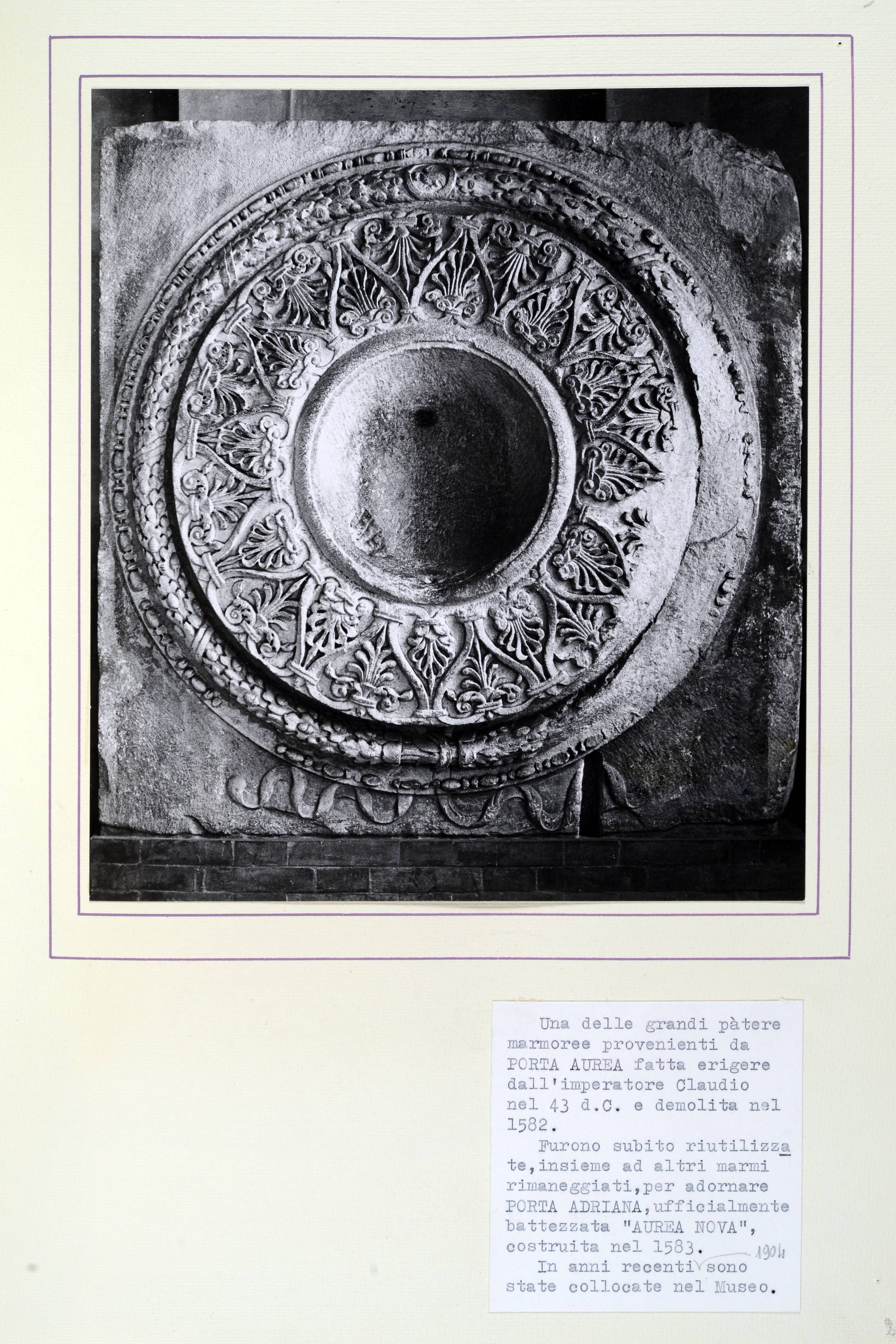 Titolo desunto da didascalia dattiloscritte incollata sul cartoncino di supporto: "Una delle grandi pàtere marmoree provenienti da Porta Aurea fatta erigere dall'imperatore Claudio nel 43 d.C. e demolita nel 1582. Furono subito riutilizzate, insieme ad altri marmi rimaneggiati, per adornare Porta Adriana, ufficialmente battezzata "Aurea Nova", costruita nel 1583. In anni recenti, 1904, sono state collocate nel museo."