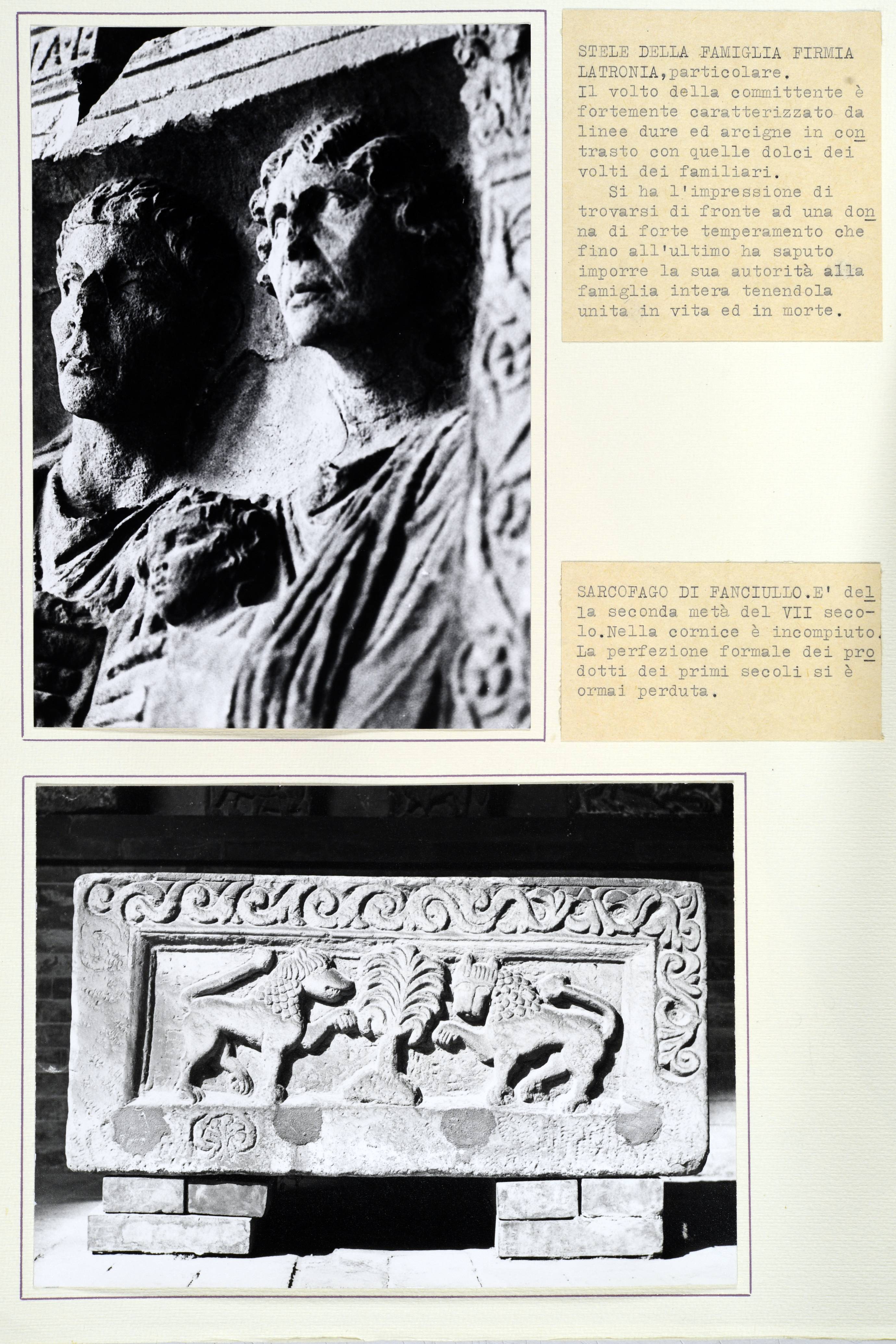 Titolo desunto da didascalie dattiloscritte incollate sul cartoncino di supporto: " Stele della famiglia Firmia Latronia, particolare. Il volto della committente è fortemente caratterizzato da linee dure ed arcigne in contrasto con quelle dolci dei volti familiari. Si ha l'impressione di trovarsi di fronte ad una donna di forte temperamento che fino all'ultimo ha saputo imporre la sua autorità alla famiglia intera tenendola unita in vita ed in morte./ Sarcofago di fanciullo. E' della seconda metà del VII secolo. Nella cornice è incompiuto. La perfezione formale dei prodotti dei primi secoli si è ormai perduta."