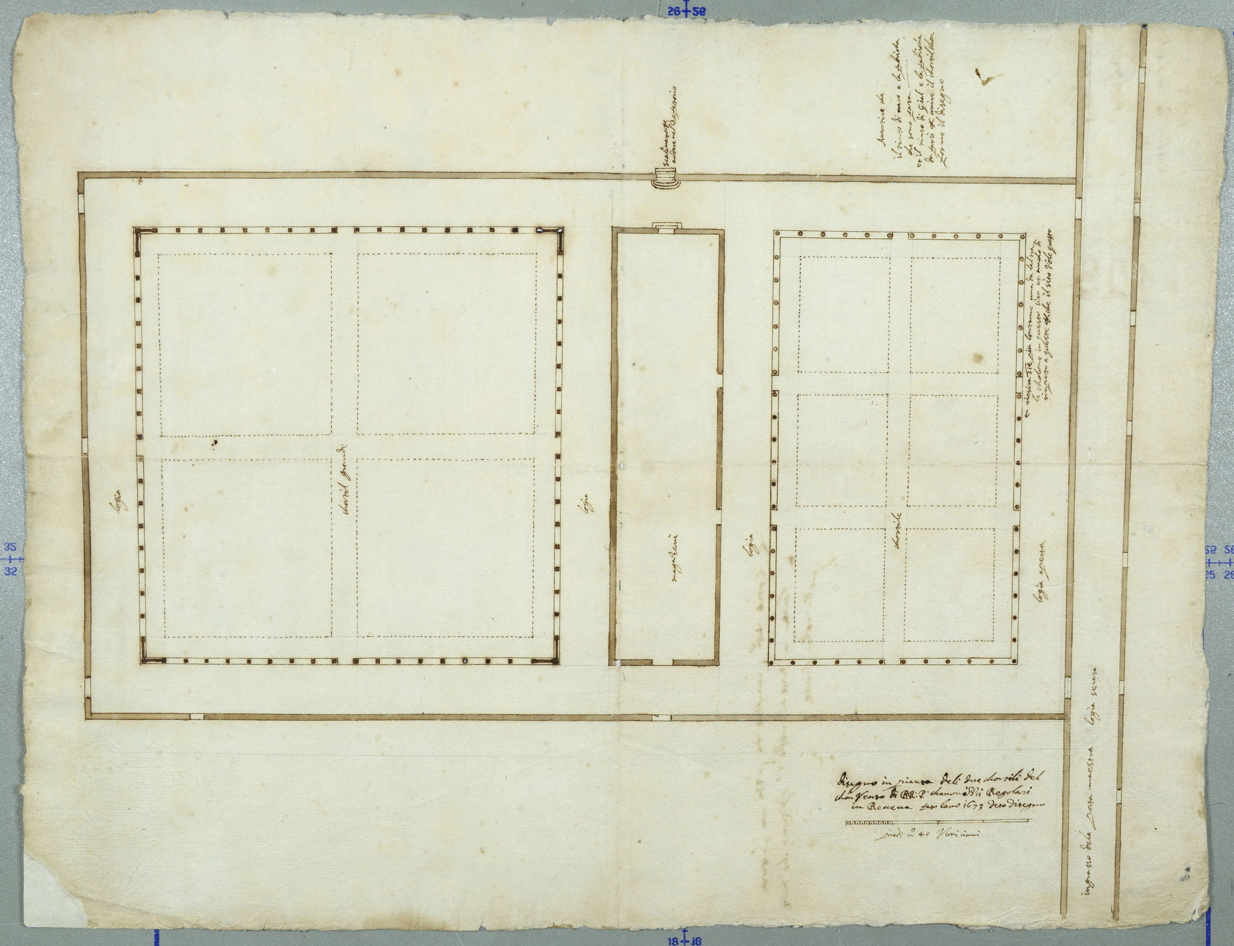 Sull'esterno il prete don Serafino Pasolini ha scritto: Disegno del claustro da farsi con gettar a terra la parte di quello di S. Agostino che divide quello dalla Morte
