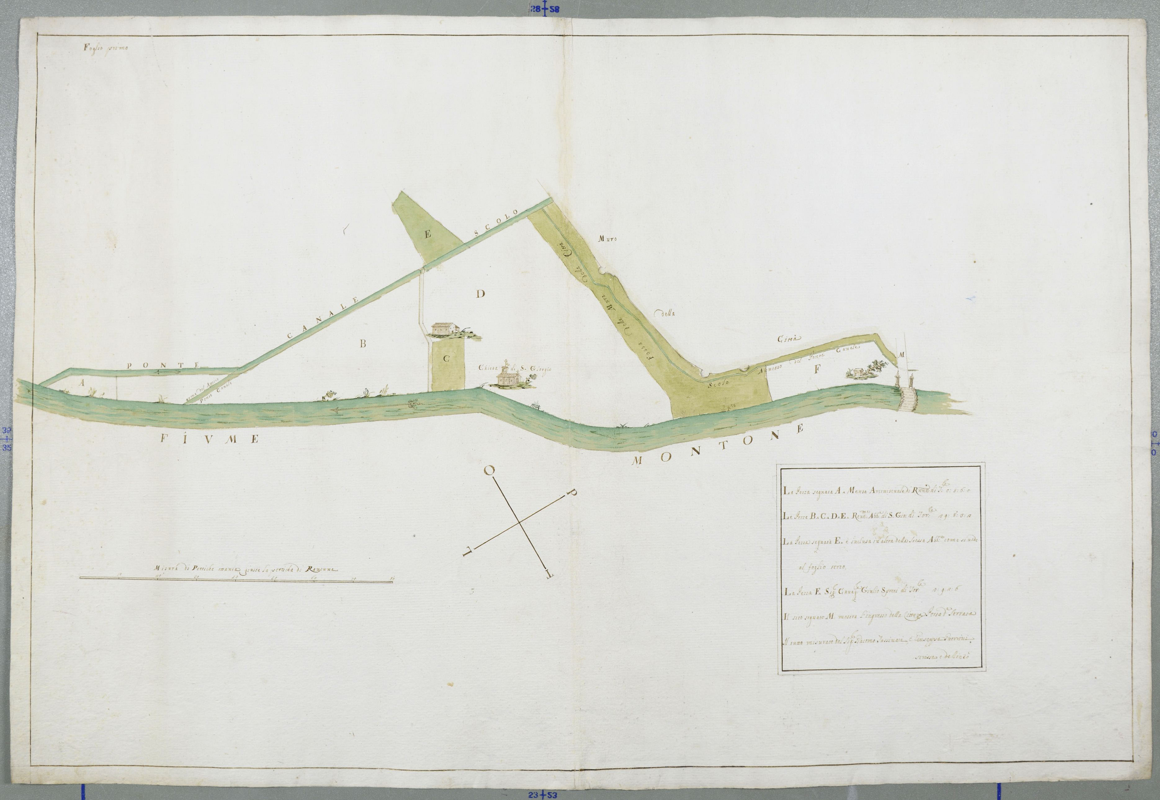Fiume Montone dal ponte Canale al ponte di Porta Serrata, chiesa di S. Giorgio, mura della città