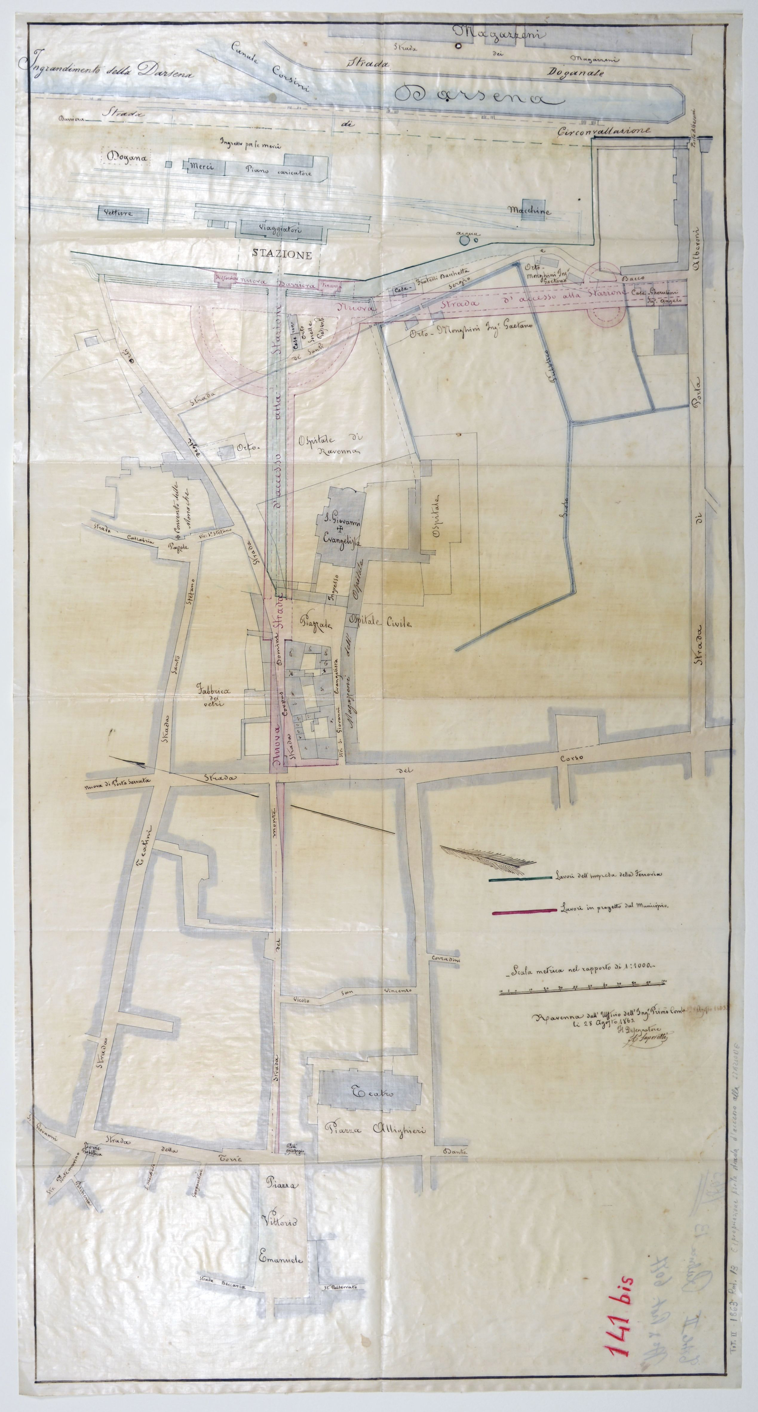 Pianta della località in cui deve erigersi la nuova stazione della ferrovia Ravenna-Castel Bolognese approvata con decreto del Ministro dei Lavori Pubblici in data Torino 31 Luglio 1862. (copia conforme) Protocollo generale: 5124/1862