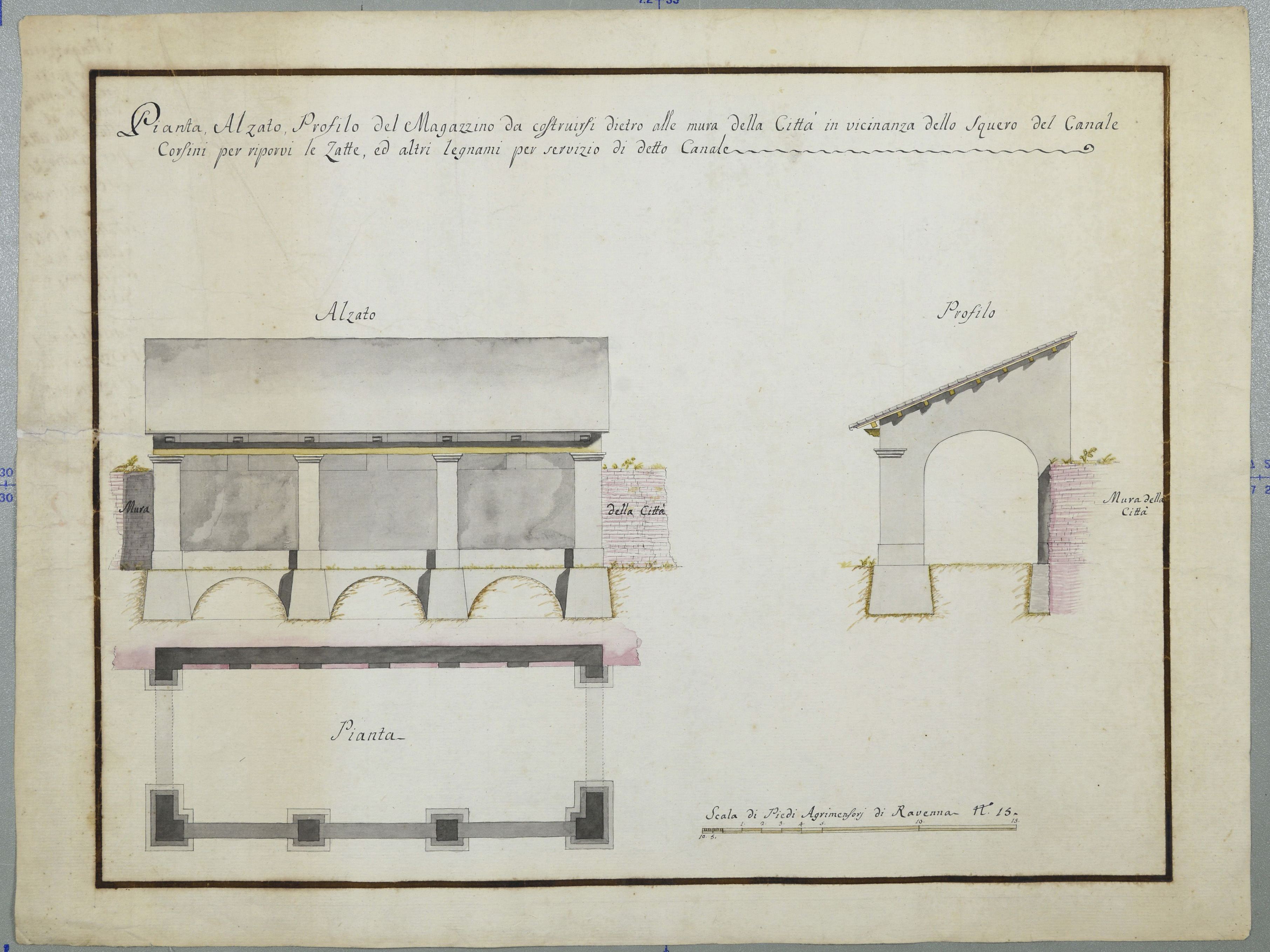 Pianta alzato profilo del magazzino da costruirsi dietro alle mura della città (angolo detto Montecavallo) in vicinanza dello squero del canale Corsini per riporvi le zatte e altri legnami per servizio detto canale