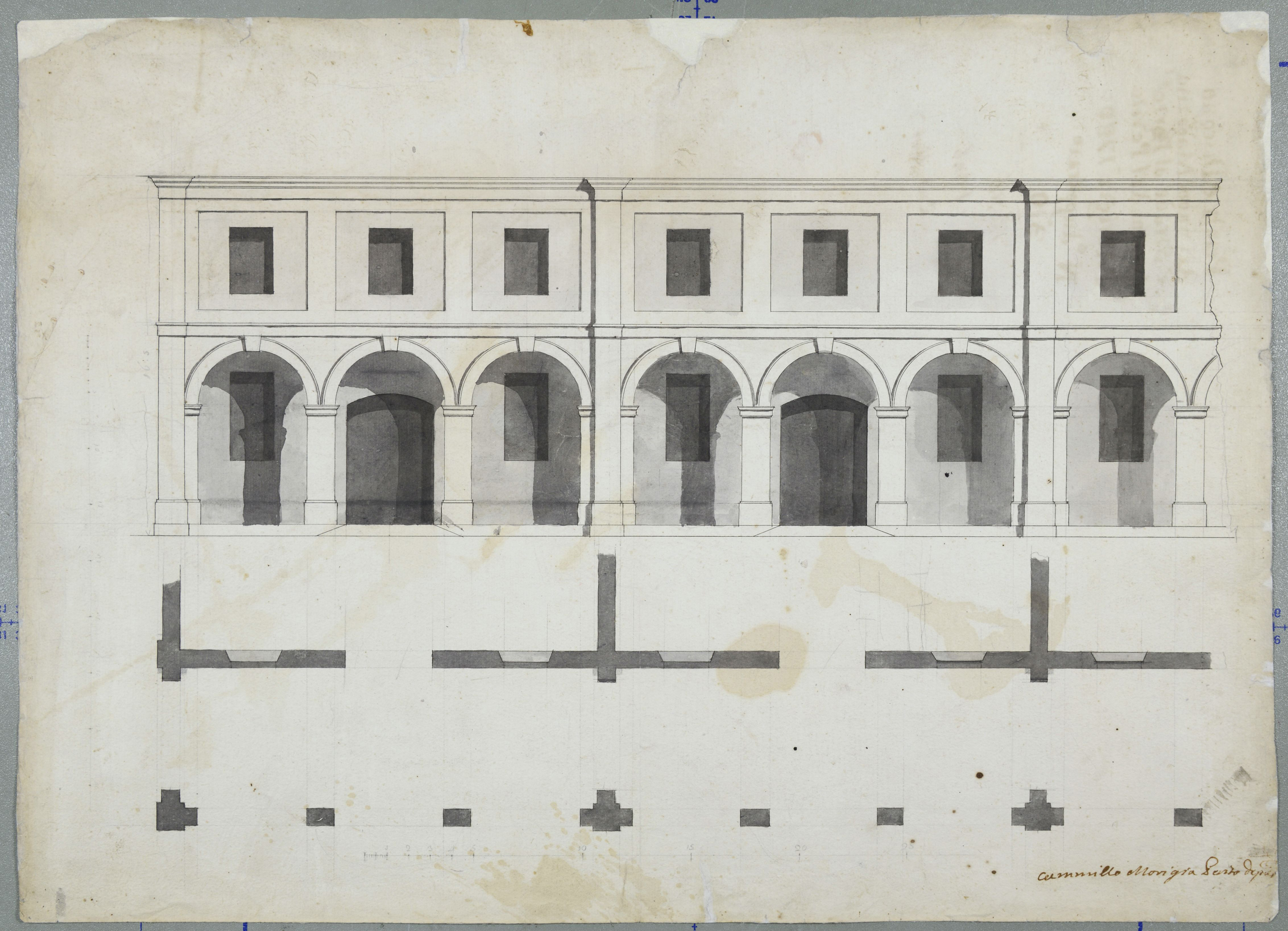 Piante, spaccato e prospetto dei nuovi magazzini da costruirsi dalla comunità di Ravenna sulla darsena del canale Corsini.