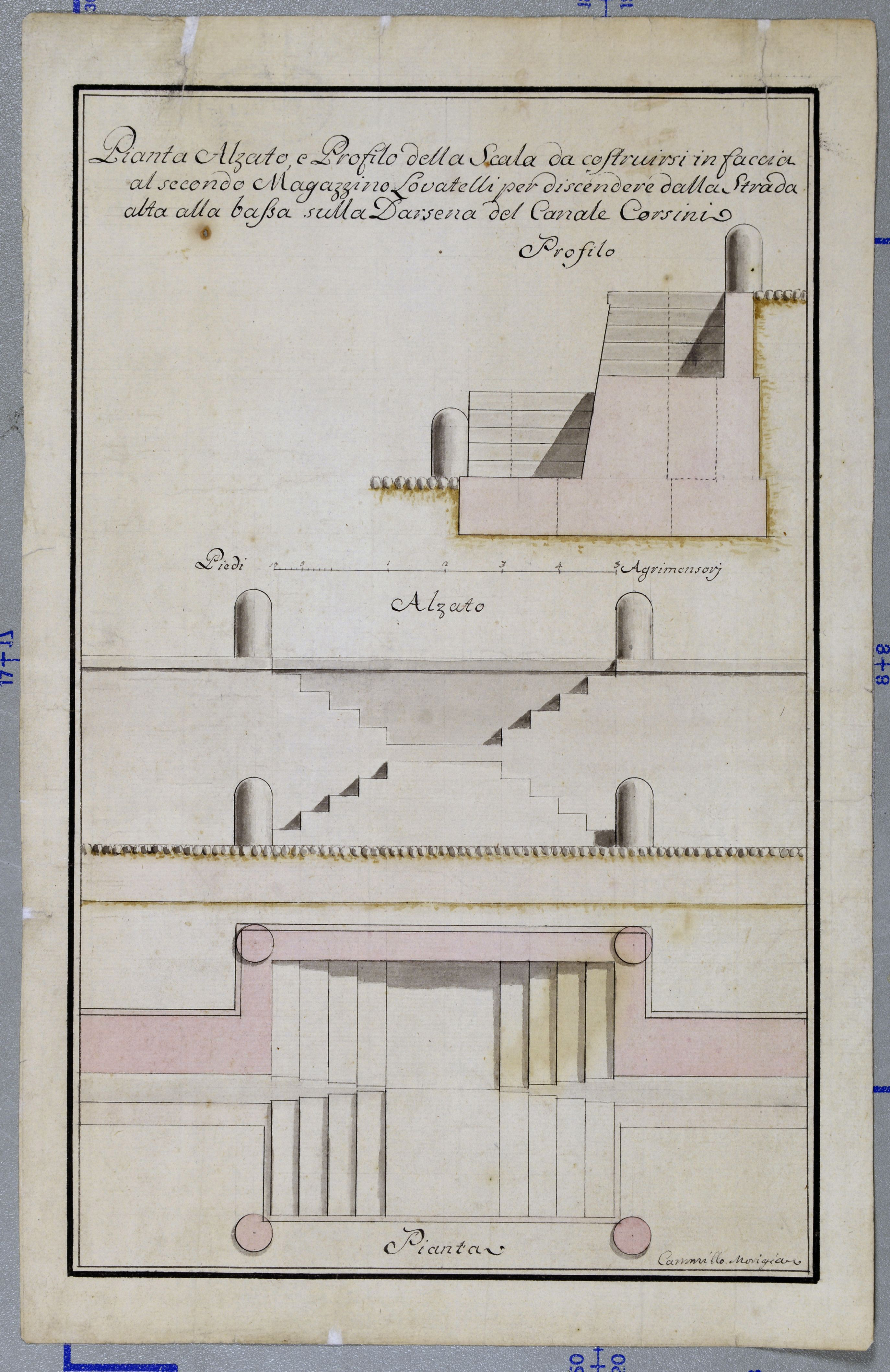 Pianta alzato e profilo della scala da costruirsi in faccia al secondo magazzino Lovatelli per discendere dalla strada alta alla bassa strada sulla Darsena del canale Corsini