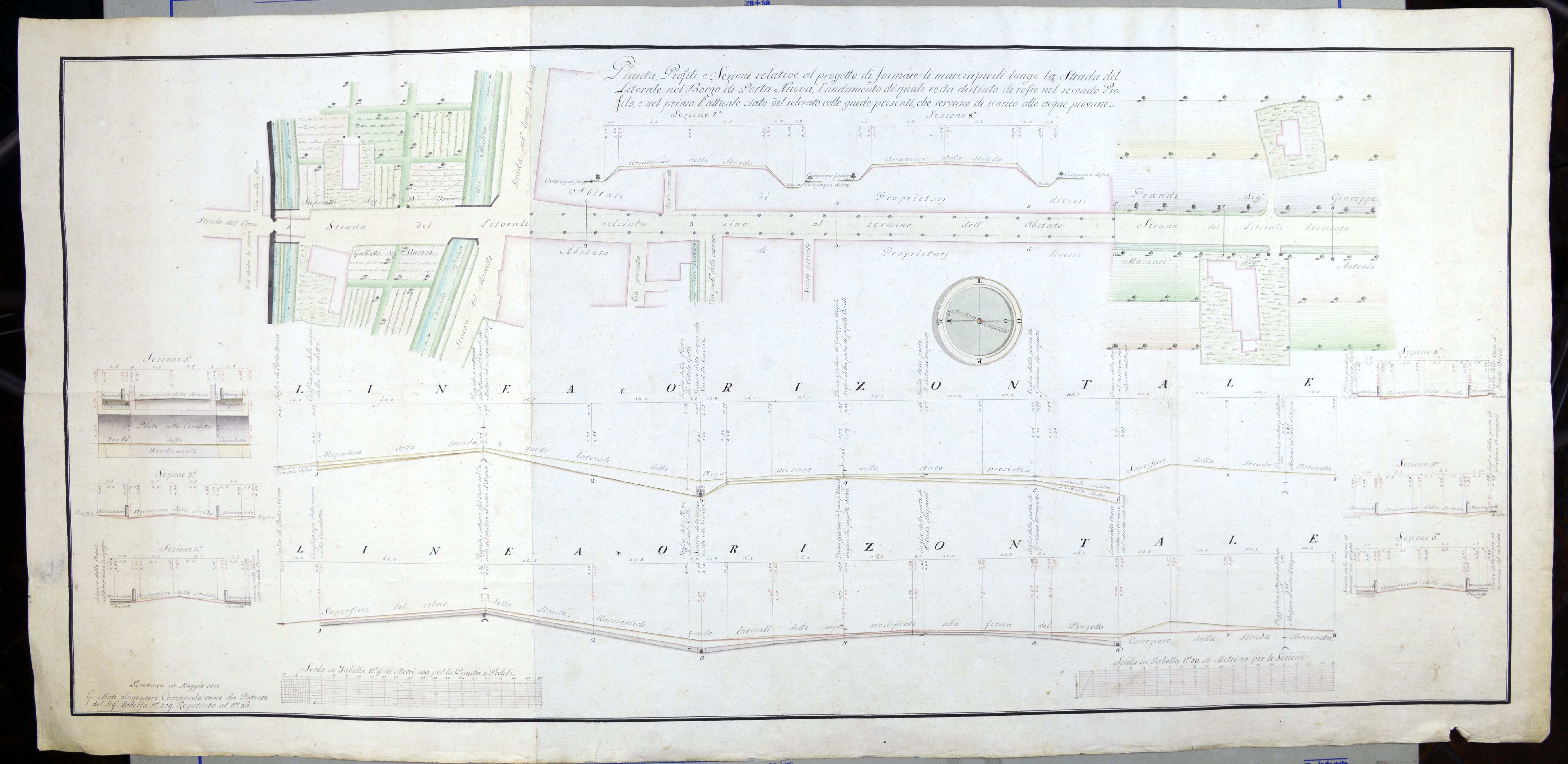 Pianta e profili e sezioni relative al progetto di formare li marciapiedi lungo la strada del litorale nel borgo di Porta Nuova