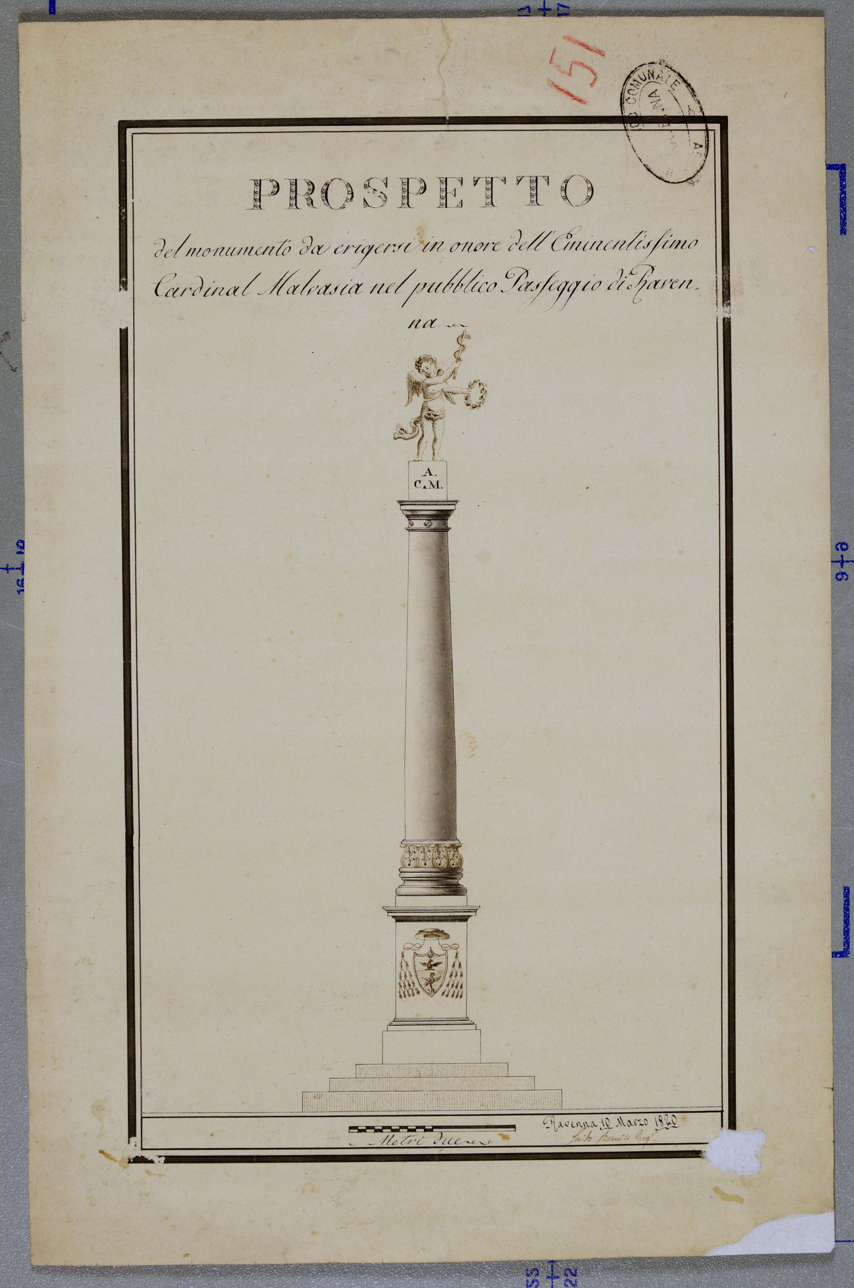 Figura del monumento al card. Malvasia nelle piazze del pubblico passeggio di Porta Nuova. Con due piante della base