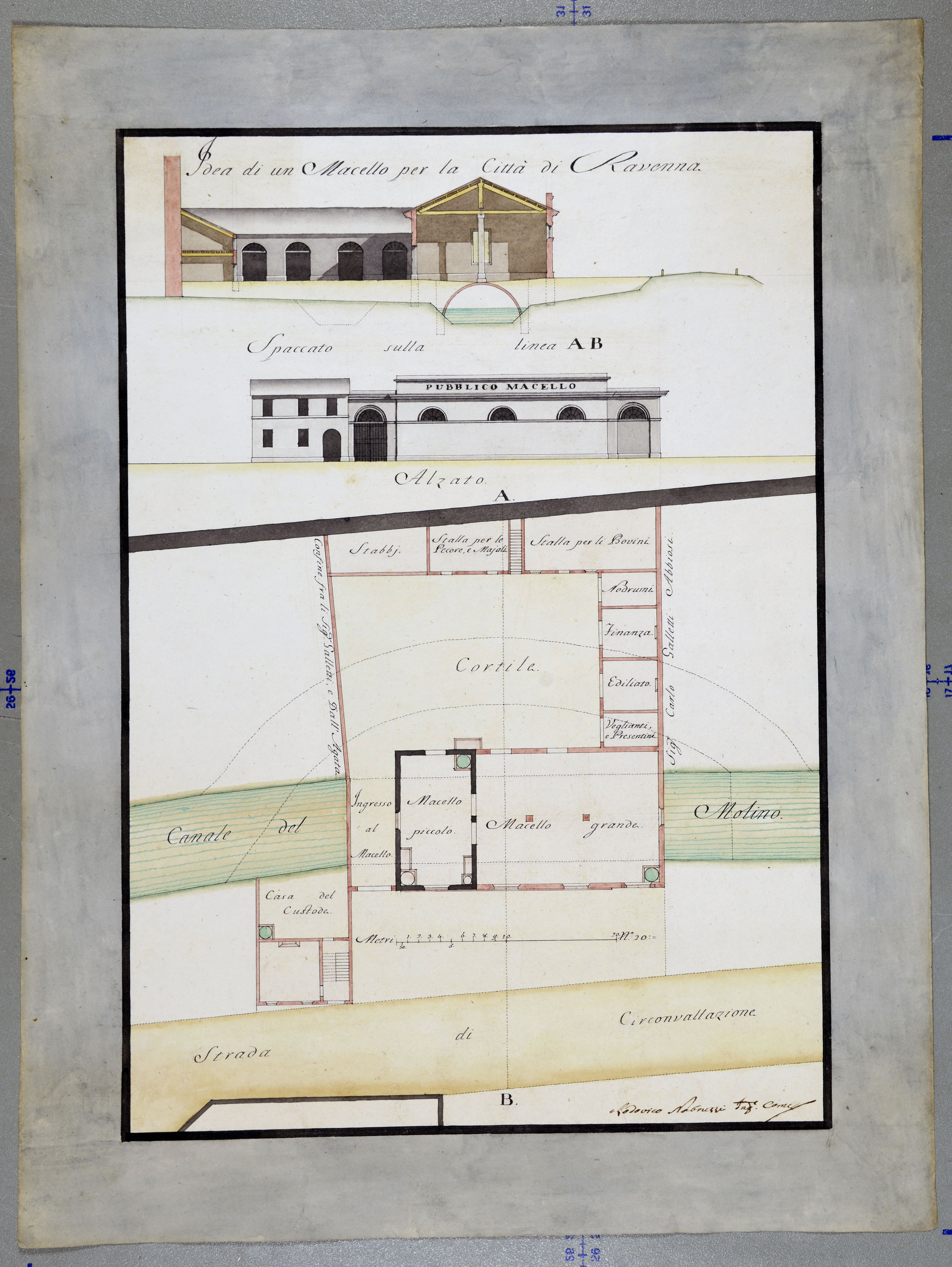 Idea di un macello per la città di Ravenna sul Canale del Molino. Pianta, spaccato e prospetto. Con perizia di 6 carte