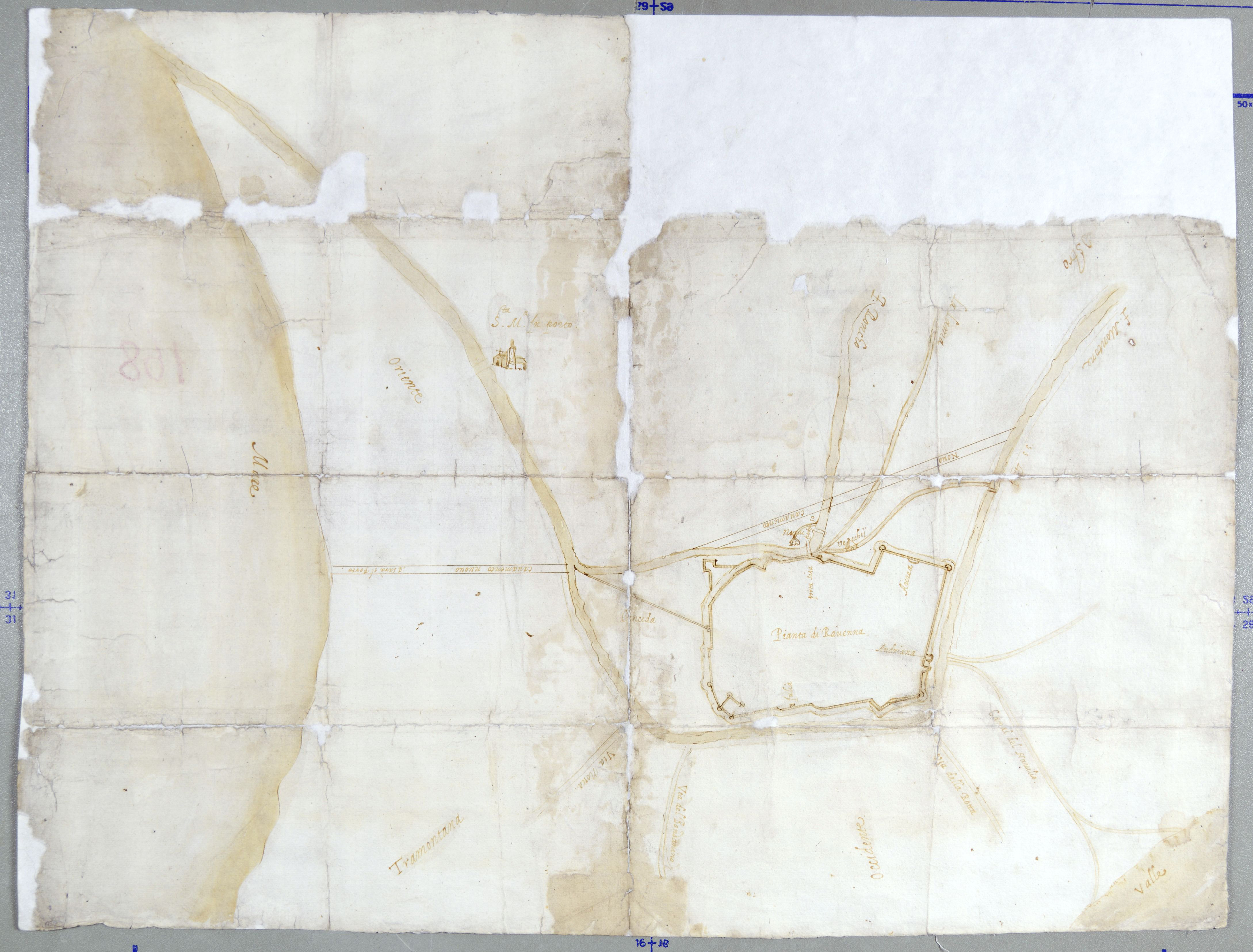 Pianta della cinta della citt� di Ravenna e del territorio adiacente (via della Rotta; Canal Naviglio; Fiume Montone; Lama; Fiume Ronco; Nuovo cavamento da farsi dalla destra del Montone sotto passando la Lama, il Ronco superiore sino alla destra del Ronco interiormente a Ravenna; Cenceda; Santa Maria in Porto; Via Nova; Via Bondanino; Molini Vecchi; Porta Sisi; Aurea; Adriana; Via Iulia.)