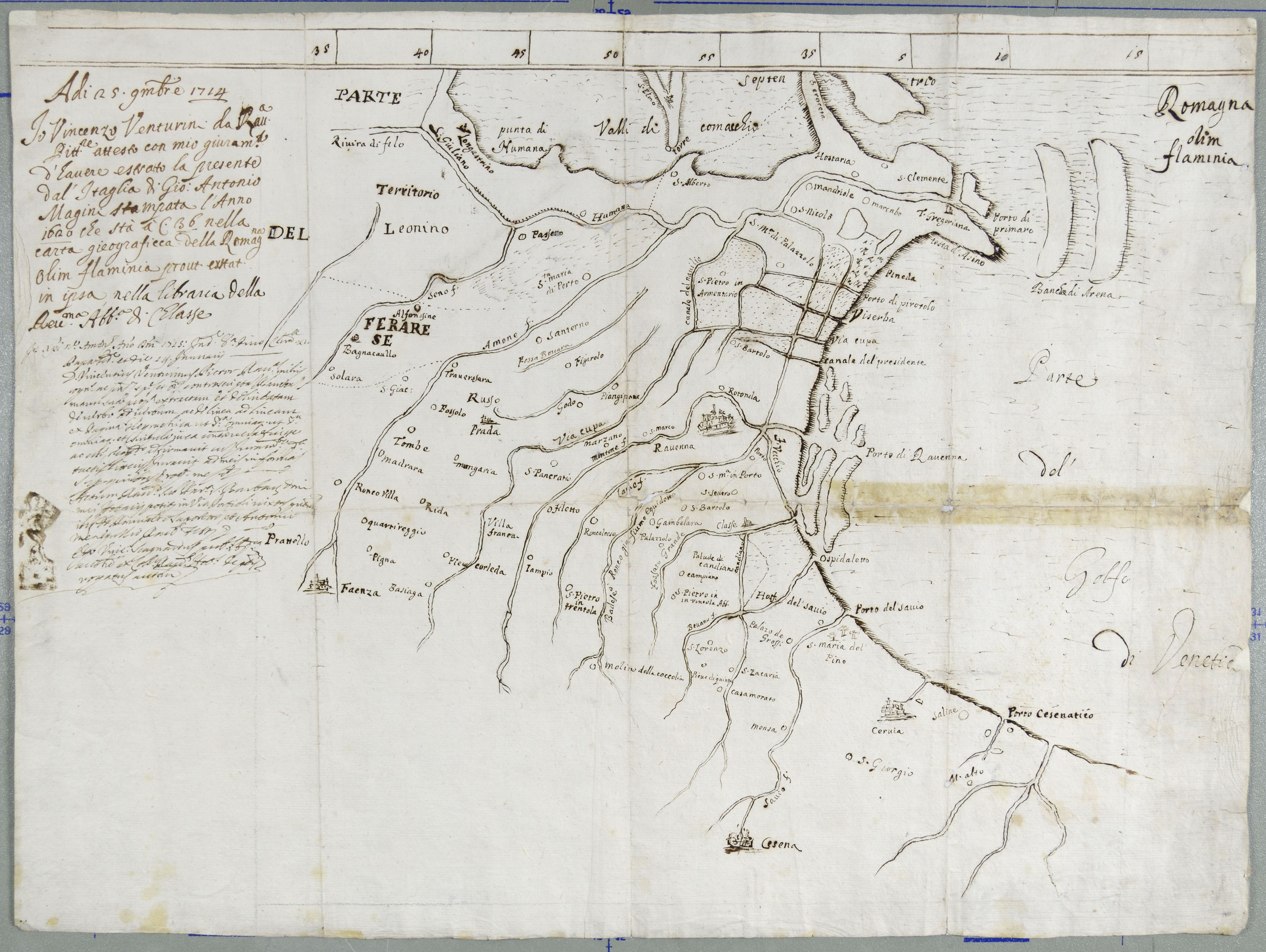 Territorio di Comacchio, Ferrara , Faenza , Forl�, Cesena e Cesenatico. �Pianta estratta da D. Vincenzo Venturini pittore dall'Italia di Gio. Antonio Magini stampata l'anno 1620 che sta a c. 36 nella carta geografica della Romagna olim Flaminia proutextat nella libraria dell'abbazia di Classe.