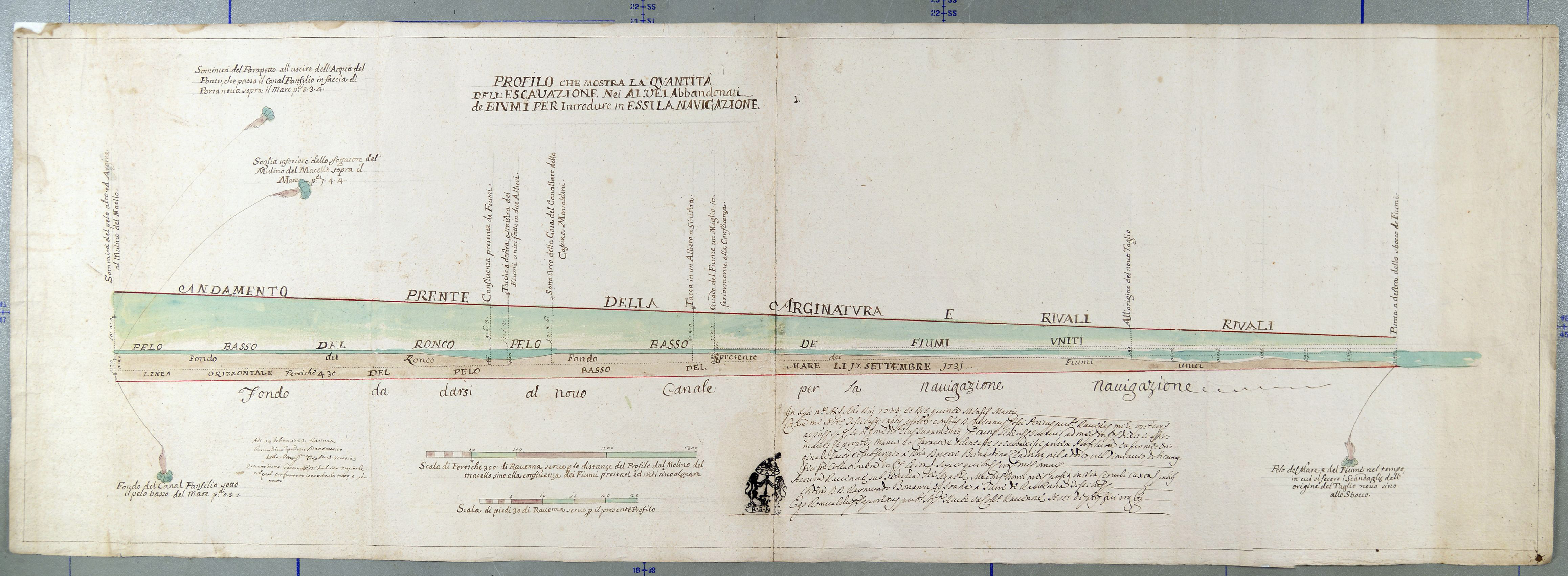 Profilo che mostra la quantit� dell'escavazione negli alvei abbandonati dei fiumi (Ronco e Montone) per introdurre in essi la navigazione