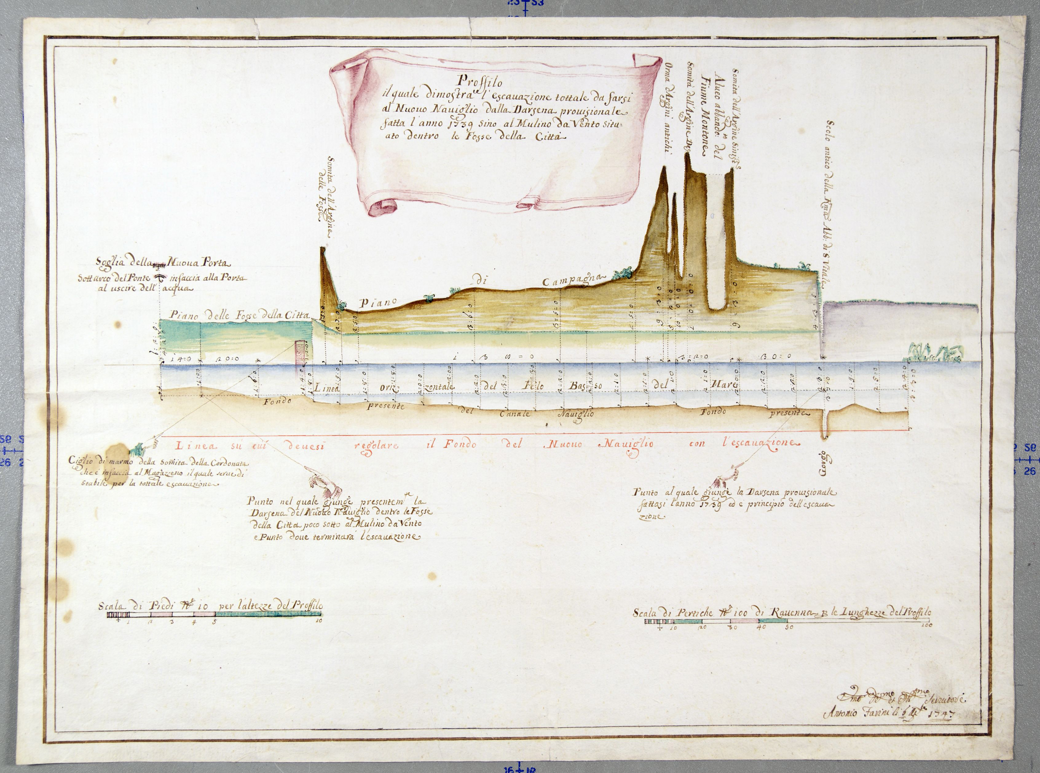 Profilo il quale dimostra l'escavazione totale da farsi al nuovo Naviglio dalla darsena provisionale fatta l'anno 1739 sino al mulino da vento situato dentro le fosse della citt�.