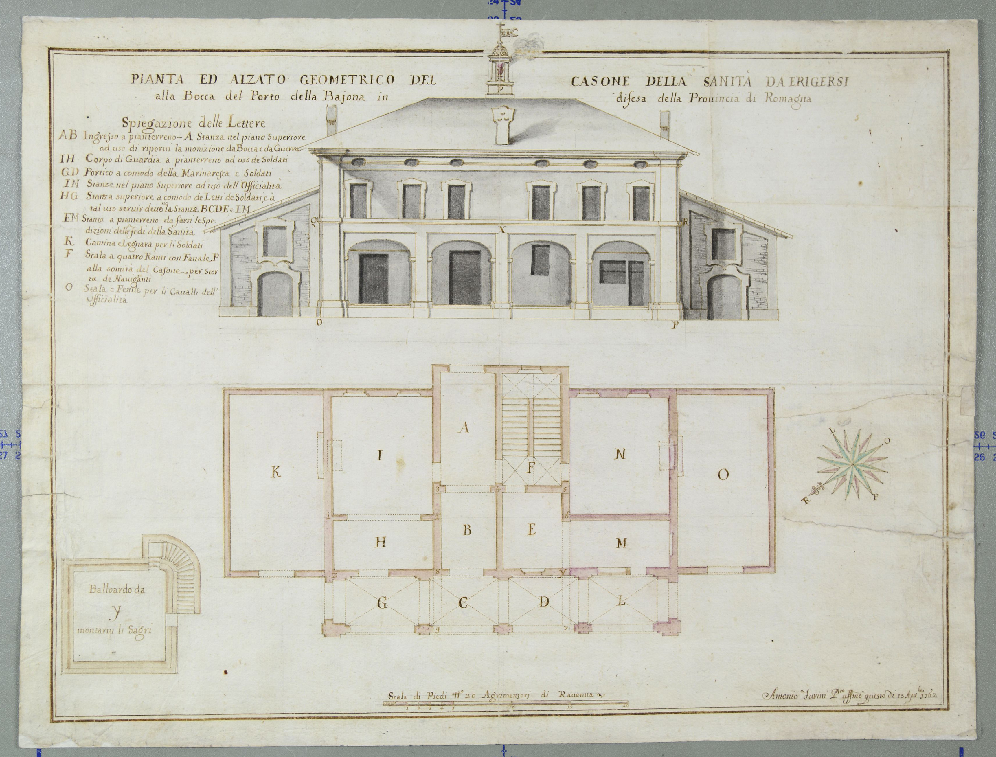 Pianta ed alzato geometrico del Casone della Sanit� (fabbrica vecchia) da erigersi alla bocca del porto della Baiona