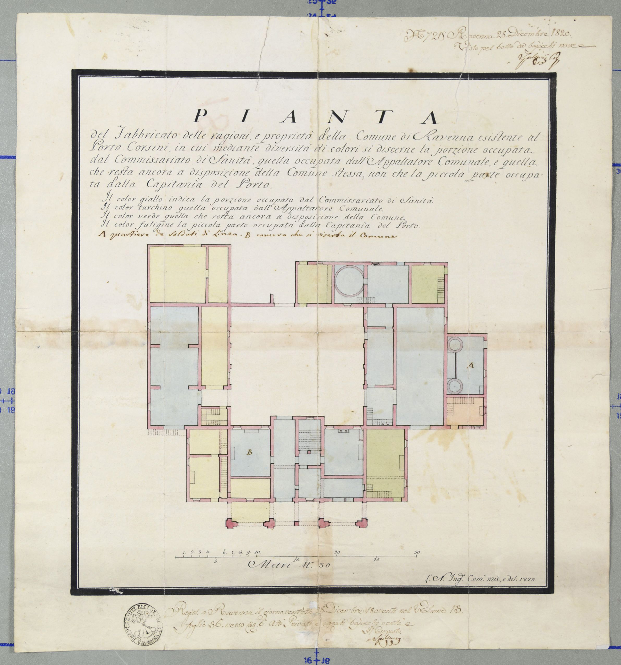 Pianta del fabbricato delle regioni e propriet� della Comune di Ravenna edificate al Porto Corsini in cui mediante diversit� di colori si discerne la porzione occupata dal comm.issariato di Sanit�, quella occupata dall'appaltatore comunale, e quella che resta ancora a disposizione della Comune stessa, nonch� la piccola parte occupata dalla Capitania del Porto