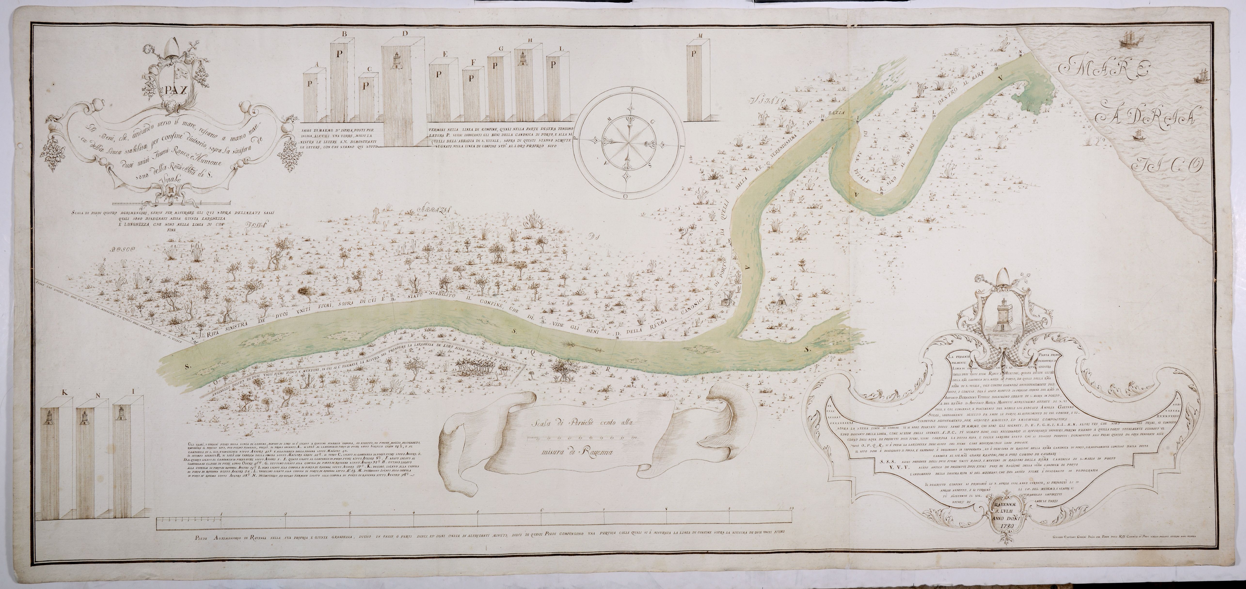 Pianta che dimostra la linea di confine che � la riga sinistra delli due fiumi uniti Ronco e Montone fra le abbazie di S. Maria in Porto e di S. Vitale