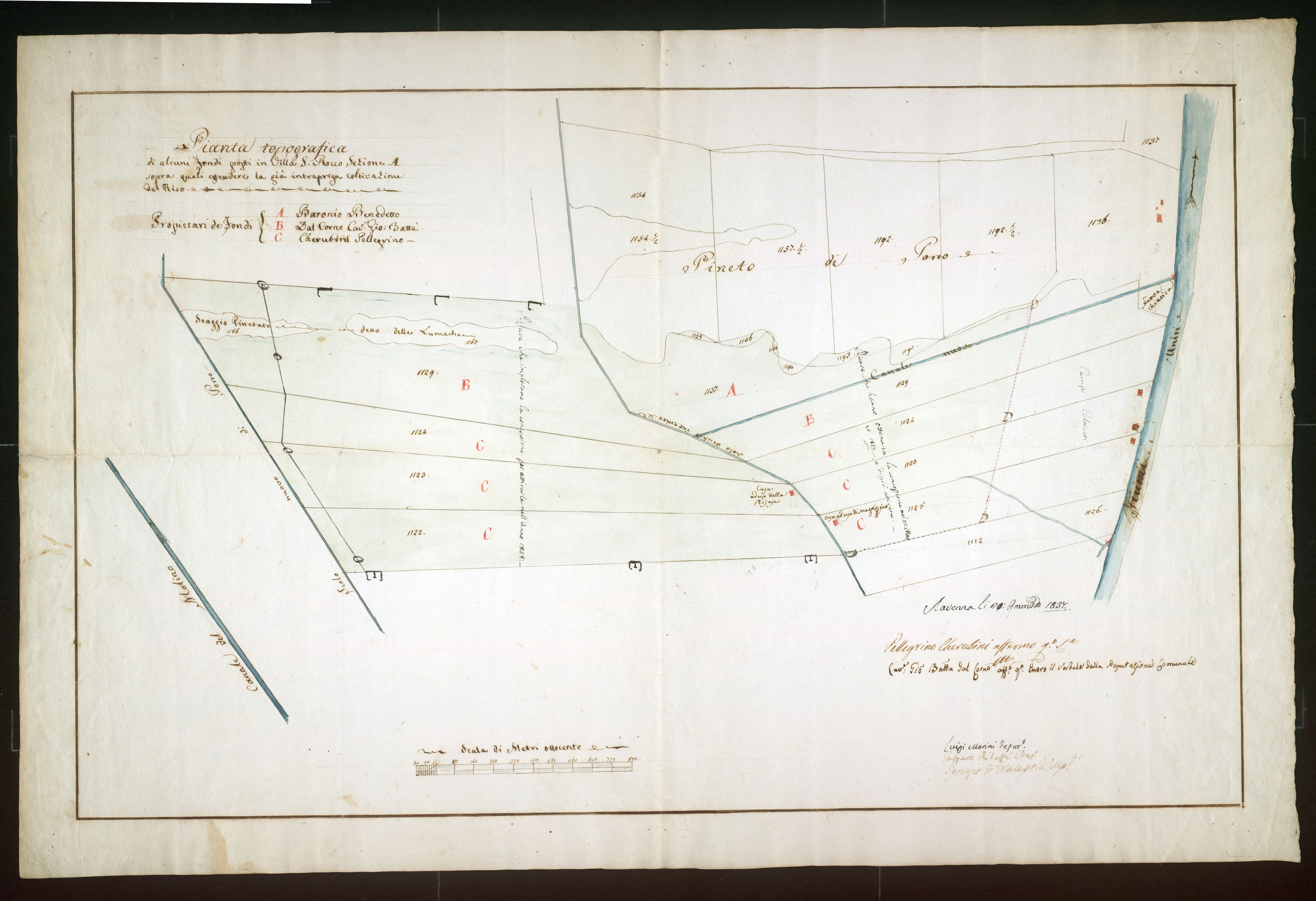 Pianta topografica di alcuni fondi (Baronio, Dal Corno, Cherubini) in villa S. Rocco sopra i quali estendere la gi� intrapresa coltivazione del riso. (Nella Cherubina, Nello Staggio delle Lumache e altrove nel pineto di Porto alla sinistra dei fiumi uniti)